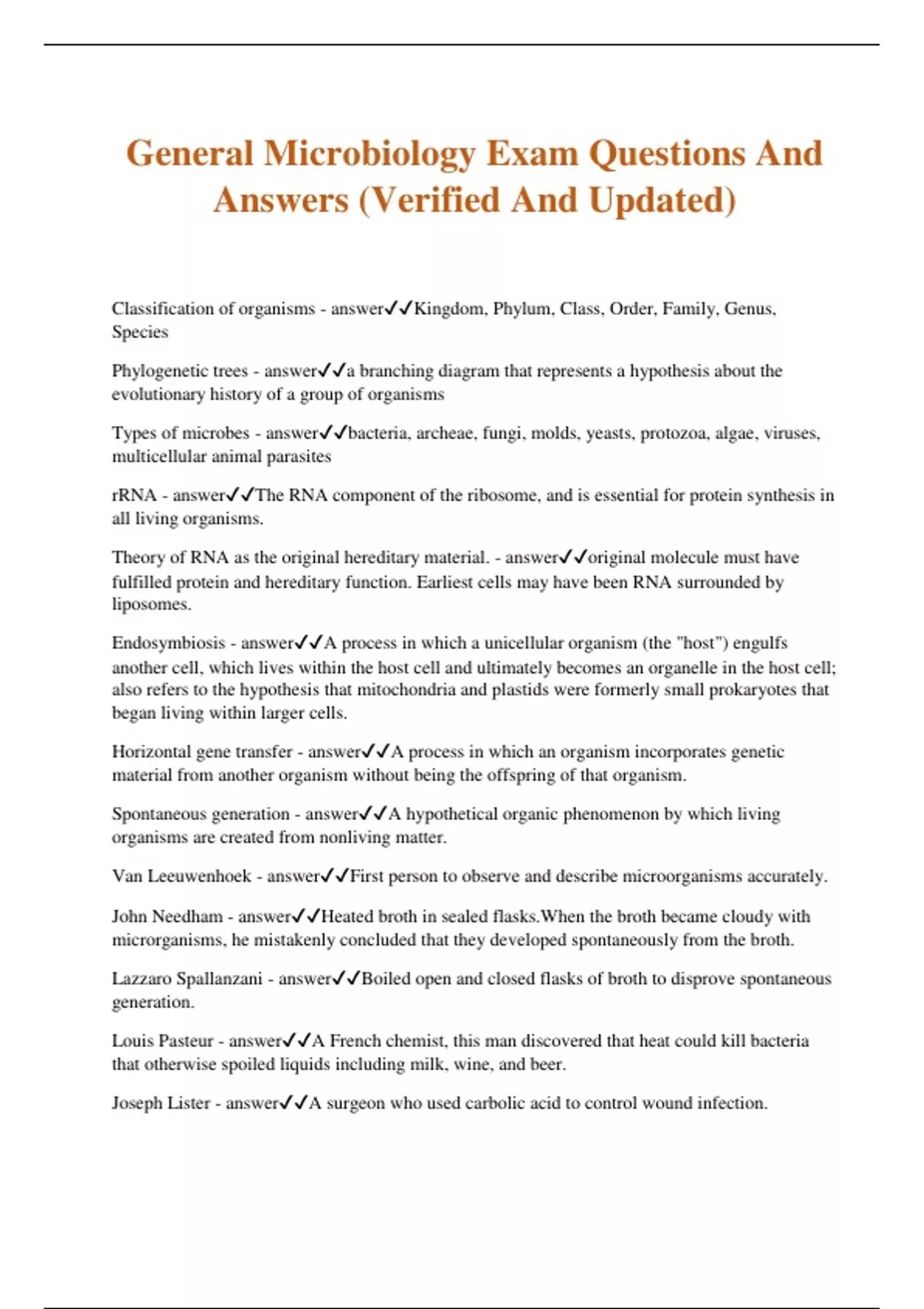 General Microbiology Exam Questions And Answers (Verified And Updated) Classification of organisms - answerKingdom, Phylum, Class, Order, Family, Genus, Species Phylogenetic trees - answera branching diagram that represents a hypothesis about the evolutionary history of a group of organisms Types of microbes - answerbacteria, archeae, fungi, molds, yeasts, protozoa, algae, viruses, multicellular animal parasites rRNA - answerThe RNA component of the ribosome, and is essential for protein synthesis in all living organisms. Theory of RNA as the original hereditary material. - answeroriginal molecule must have fulfilled protein and hereditary function. Earliest cells may have been RNA surrounded by liposomes. Endosymbiosis - answerA process in which a unicellular organism (the "host") engulfs another cell, which lives within the host cell and ultimately becomes an organelle in the host cell; also refers to the hypothesis that mitochondria and plastids were formerly small prokaryotes that began living within larger cells. Horizontal gene transfer - answerA process in which an organism incorporates genetic material from another organism without being the offspring of that organism. Spontaneous generation - answerA hypothetical organic phenomenon by which living organisms are created from nonliving matter. Van Leeuwenhoek - answerFirst person to observe and describe microorganisms accurately. John Needham - answerHeated broth in sealed flasks.When the broth became cloudy with microrganisms, he mistakenly concluded that they developed spontaneously from the broth. Lazzaro Spallanzani - answerBoiled open and closed flasks of broth to disprove spontaneous generation. Louis Pasteur - answerA French chemist, this man discovered that heat could kill bacteria that otherwise spoiled liquids including milk, wine, and beer. Joseph Lister - answerA surgeon who used carbolic acid to control wound infection.