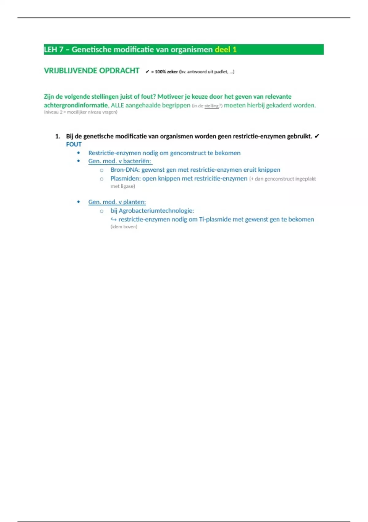 1. Bij de genetische modificatie van organismen worden geen restrictie-enzymen gebruikt. ✔️