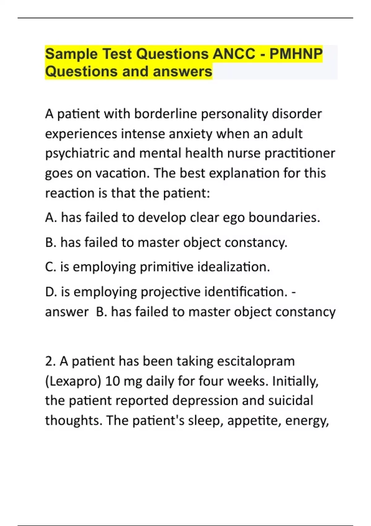 A patient with borderline personality disorder experiences intense anxiety when an adult psychiatric and mental health nurse practitioner goes on vacation. The best explanation for this reaction is that the patient: A. has failed to develop clear ego boundaries. B. has failed to master object constancy. C. is employing primitive idealization. D. is employing projective identification. B. has failed to master object constancy 2. A patient has been taking escitalopram (Lexapro) 10 mg daily for four weeks. Initially, the patient reported depression and suicidal thoughts. The patient's sleep, appetite, energy, and appearance have now begun to improve. Which statement applies to this patient? A. The medication should be discontinued. B. The medication should be increased. C. The patient's risk for suicide is not a concern. D. The patient's suicide potential is increased. D. The patient's suicide potential is increased. Previous Play Next Rewind 10 seconds Move forward 10 seconds Unmute 0:00 / 0:15 Full screen Brainpower Read More 3. Which behavior reflects existentially oriented therapy? A. Attempting to understand a patient's subjective world B. Challenging a patient's irrational beliefs C. Developing specific plans for change D. Establishing general group goals A. Attempting to understand a patient's subjective world 4. Serving as a member on a crisis team, an adult psychiatric and mental health nurse practitioner provides crisis intervention to the survivors of a plane crash. Forty-eight hours after the accident, the survivors describe vivid flashbacks, startle reactions, and disrupted sleep patterns. The nurse practitioner responds by: A. advising the survivors to consider using a hypnotic medication for a brief period. B. educating the survivors about prodromal symptoms of posttraumatic stress disorder. C. encouraging the survivors to rest during the day. D. suggesting that the survivors join a posttrauma support group. B. educating the survivors about prodromal symptoms of posttraumatic stress disorder. 5. An adult psychiatric and mental health nurse practitioner uses the interpersonal therapy model with a patient to establish a therapeutic alliance based upon empathy and trust. The nurse practitioner recognizes the patient's readiness to terminate therapy when the patient demonstrates: A. an understanding that leaving a significant other may be painful, but also presents an opportunity for growth. B. breathing and muscle relaxation exercises that decrease muscle tension and anxiety. C. free association, and considers the nurse practitioner's interpretation of the patient's dreams. D. new adaptive skills and responses after completing "homework assignments." A. an understanding that leaving a significant other may be painful, but also presents an opportunity for growth. 6. An Hispanic patient informs an adult psychiatric and mental health nurse practitioner during a wellness visit that he or she occasionally uses hot chili juice to relieve a "nervous condition." The patient denies any complaints related to this practice. The nurse practitioner's response is to: A. actively discourage the patient from continuing this treatment. B. offer a medication to treat the nervous condition. C. suggest an alternative food to relieve the nervous condition. D. view this as a self-care ritual that needs to be preserved. D. view this as a self-care ritual that needs to be preserved. 7. Before an older adult patient initiates pharmacotherapy with a medication that is cleared by the kidneys, an adult psychiatric and mental health nurse practitioner assesses the patient's: A. blood urea nitrogen level. B. creatinine clearance. C. specific gravity. D. urinary sediment. B. creatinine clearance. 8. An adult psychiatric and mental health nurse practitioner uses a cognitive-behavioral approach to help an adolescent patient change self-defeating behaviors. After identifying the initial stressor that is causing the inappropriate behavior, the therapeutic intervention is to identify: A. alternative positive responses to the stressor. B. negative consequences of the behavioral response to the stressor. C. possible outcomes of alternative responses. D. rational and irrational beliefs about the stressor. D. rational and irrational beliefs about the stressor. 9. Which characteristic of fluoxetine (Prozac) provides the greatest degree of safety for patients who have severe depression? A. Greater efficacy than tricyclic antidepressants B. Less potential for drug interaction C. Less potential for injury with intentional overdose D. Less potential for suicidal thinking C. Less potential for injury with intentional overdose 10. When lobbying a local congressional representative to include nurse practitioners in reimbursement for services in all areas of the country, an adult psychiatric and mental health nurse practitioner emphasizes the: A. ability of nurse practitioners to provide health care that patients need. B. fact that nurse practitioners are caring in their patient care delivery. C. importance of broadening the scope of nursing practice. D. necessity of offering equivalent services both to urban and rural patients. A. ability of nurse practitioners to provide health care that patients need. 11. For 12 years, a 65-year-old patient with bipolar affective disorder has been treated with lithium (Eskalith) 900 mg daily. When oral hydrochlorothiazide (HCTZ) 12.5 mg daily is added for hypertension, the patient develops nausea, vomiting, ataxia, and muscle weakness and the patient's serum lithium level is 2.0 mEq/L. The interaction of the lithium and the thiazide diuretic has induced: A. hypokalemia. B. hyponatremia. C. increased renal clearance of lithium. D. reduced renal clearance of lithium. D. reduced renal clearance of lithium.