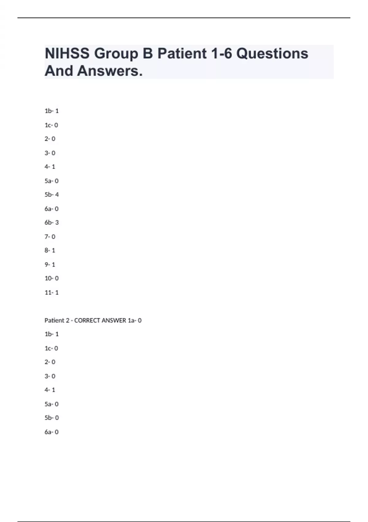NIHSS Group B Patient 1-6 Questions And Answers. 1b- 1 1c- 0 2- 0 3- 0 4- 1 5a- 0 5b- 4 6a- 0 6b- 3 7- 0 8- 1 9- 1 10- 0 11- 1 Patient 2 - CORRECT ANSWER 1a- 0 1b- 1 1c- 0 2- 0 3- 0 4- 1 5a- 0 5b- 0 6a- 0