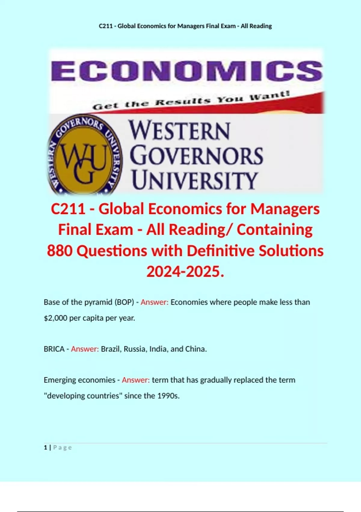 , C211 - Global Economics for Managers Final Exam - All Reading