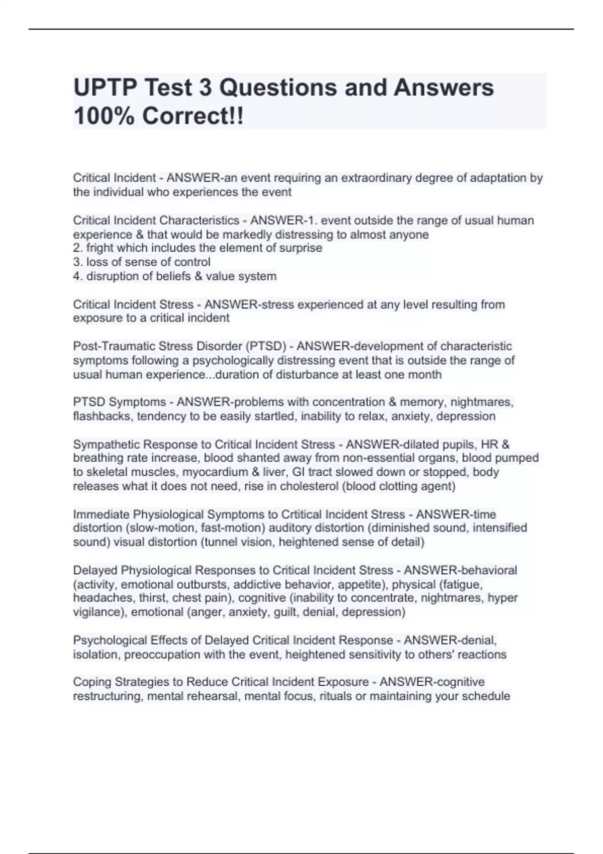 Critical Incident - ANSWER-an event requiring an extraordinary degree of adaptation by the individual who experiences the event Critical Incident Characteristics - ANSWER-1. event outside the range of usual human experience & that would be markedly distressing to almost anyone 2. fright which includes the element of surprise 3. loss of sense of control 4. disruption of beliefs & value system Critical Incident Stress - ANSWER-stress experienced at any level resulting from exposure to a critical incident Post-Traumatic Stress Disorder (PTSD) - ANSWER-development of characteristic symptoms following a psychologically distressing event that is outside the range of usual human experience...duration of disturbance at least one month PTSD Symptoms - ANSWER-problems with concentration & memory, nightmares, flashbacks, tendency to be easily startled, inability to relax, anxiety, depression Sympathetic Response to Critical Incident Stress - ANSWER-dilated pupils, HR & breathing rate increase, blood shanted away from non-essential organs, blood pumped to skeletal muscles, myocardium & liver, GI tract slowed down or stopped, body releases what it does not need, rise in cholesterol (blood clotting agent) Immediate Physiological Symptoms to Crtitical Incident Stress - ANSWER-time distortion (slow-motion, fast-motion) auditory distortion (diminished sound, intensified sound) visual distortion (tunnel vision, heightened sense of detail) Delayed Physiological Responses to Critical Incident Stress - ANSWER-behavioral (activity, emotional outbursts, addictive behavior, appetite), physical (fatigue, headaches, thirst, chest pain), cognitive (inability to concentrate, nightmares, hyper vigilance), emotional (anger, anxiety, guilt, denial, depression) Psychological Effects of Delayed Critical Inci
