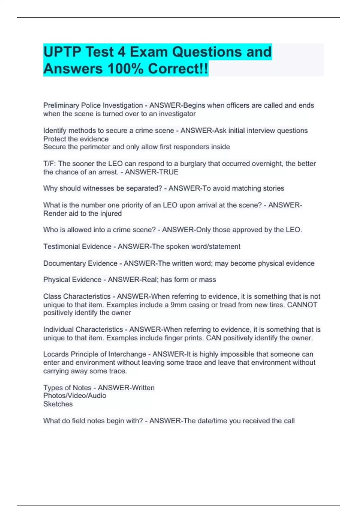 Preliminary Police Investigation - ANSWER-Begins when officers are called and ends when the scene is turned over to an investigator Identify methods to secure a crime scene - ANSWER-Ask initial interview questions Protect the evidence Secure the perimeter and only allow first responders inside T/F: The sooner the LEO can respond to a burglary that occurred overnight, the better the chance of an arrest. - ANSWER-TRUE Why should witnesses be separated? - ANSWER-To avoid matching stories What is the number one priority of an LEO upon arrival at the scene? - ANSWER-Render aid to the injured Who is allowed into a crime scene? - ANSWER-Only those approved by the LEO. Testimonial Evidence - ANSWER-The spoken word/statement Documentary Evidence - ANSWER-The written word; may become physical evidence Physical Evidence - ANSWER-Real; has form or mass Class Characteristics - ANSWER-When referring to evidence, it is something that is not unique to that item. Examples include a 9mm casing or tread from new tires. CANNOT positively identify the owner Individual Characteristics - ANSWER-When referring to evidence, it is something that is unique to that item. Examples include finger prints. CAN positively identify the owner. Locards Principle of Interchange - ANSWER-It is highly impossible that someone can enter and environment without leaving some trace and leave that environment without carrying away some trace. Types of Notes - ANSWER-Written Photos/Video/Audio Sketches What do field notes begin with? - ANSWER-The date/time you received the call If you make an error