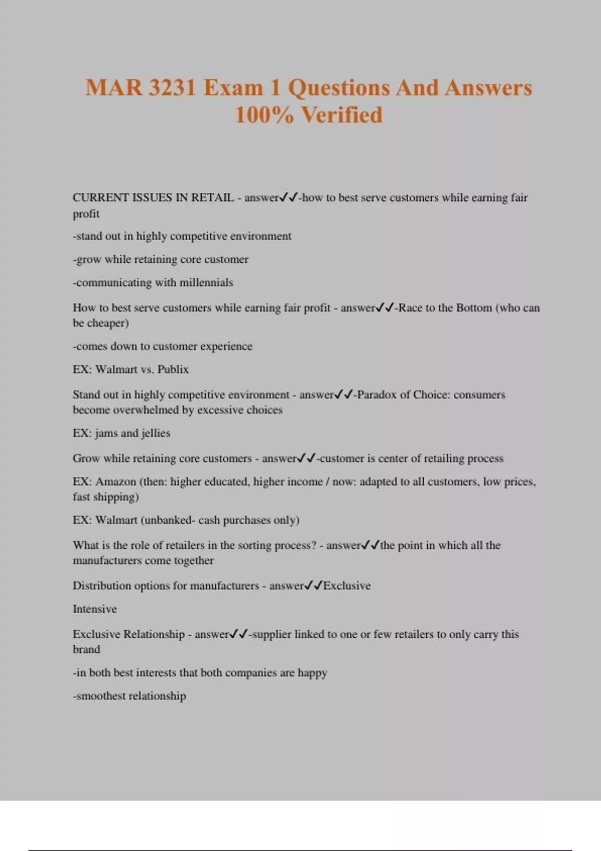 MAR 3231 Exam 1 Questions And Answers 100% Verified CURRENT ISSUES IN RETAIL - answer-how to best serve customers while earning fair profit -stand out in highly competitive environment -grow while retaining core customer -communicating with millennials How to best serve customers while earning fair profit - answer-Race to the Bottom (who can be cheaper) -comes down to customer experience EX: Walmart vs. Publix Stand out in highly competitive environment - answer-Paradox of Choice: consumers become overwhelmed by excessive choices EX: jams and jellies Grow while retaining core customers - answer-customer is center of retailing process EX: Amazon (then: higher educated, higher income / now: adapted to all customers, low prices, fast shipping) EX: Walmart (unbanked- cash purchases only) What is the role of retailers in the sorting process? - answerthe point in which all the manufacturers come together Distribution options for manufacturers - answerExclusive Intensive Exclusive Relationship - answer-supplier linked to one or few retailers to only carry this brand -in both best interests that both companies are happy -smoothest relationship