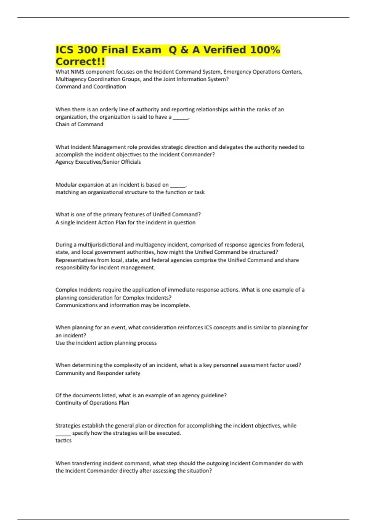 ICS 300 Final Exam Q & A Verified 100% Correct!! What NIMS component focuses on the Incident Command System, Emergency Operations Centers, Multiagency Coordination Groups, and the Joint Information System? Command and Coordination When there is an orderly line of authority and reporting relationships within the ranks of an organization, the organization is said to have a _____. Chain of Command What Incident Management role provides strategic direction and delegates the authority needed to accomplish the incident objectives to the Incident Commander? Agency Executives/Senior Officials Modular expansion at an incident is based on _____. matching an organizational structure to the function or task