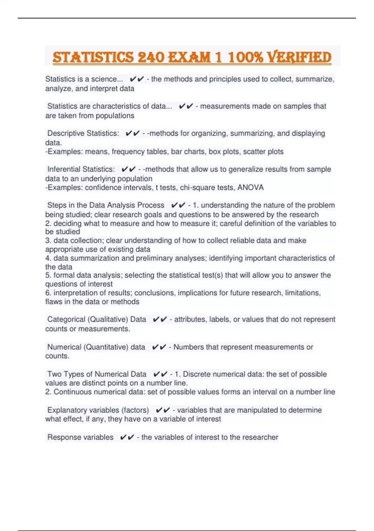 Statistics 240 exam 1 100% Verified
