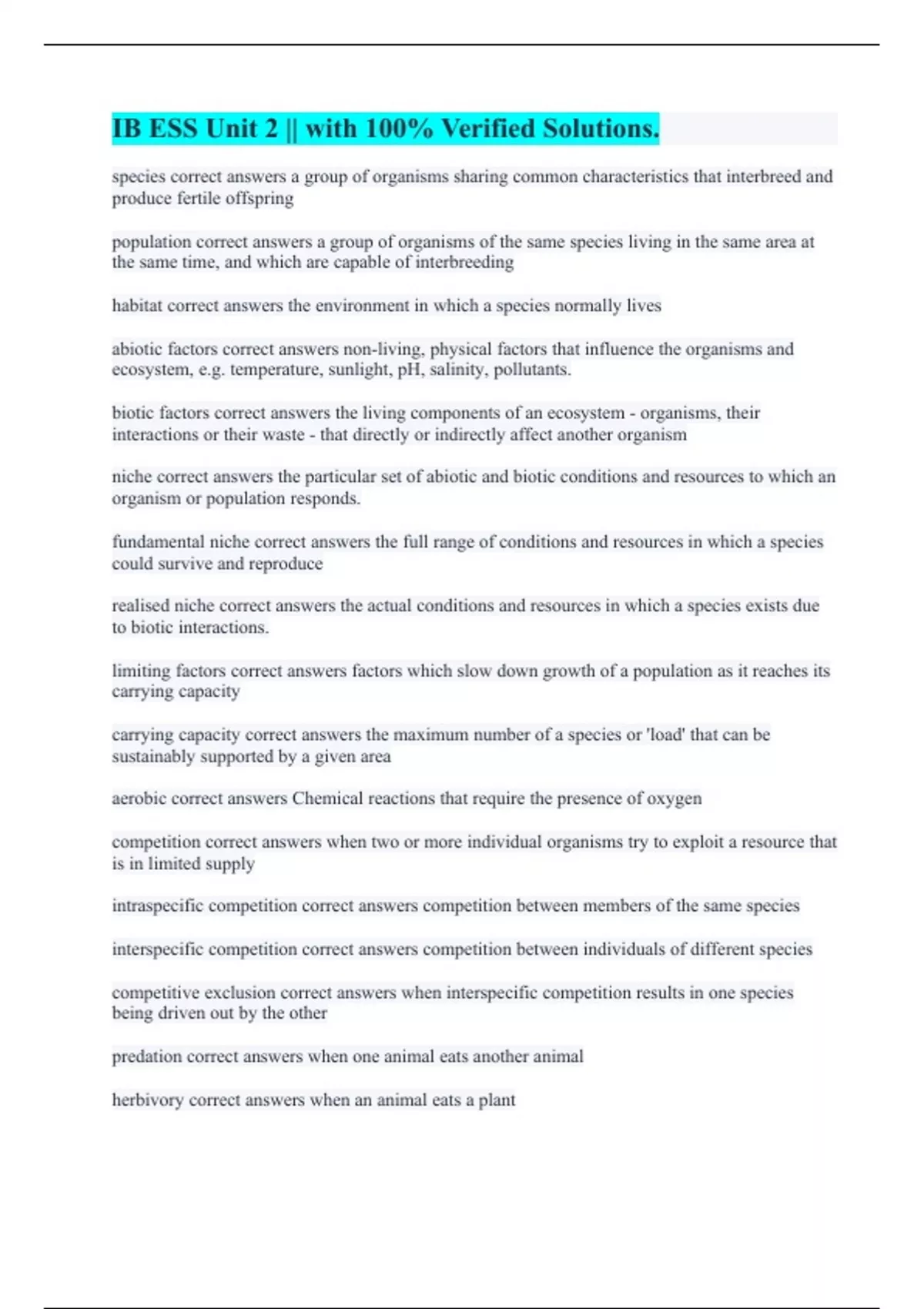 species correct answers a group of organisms sharing common characteristics that interbreed and produce fertile offspring population correct answers a group of organisms of the same species living in the same area at the same time, and which are capable of interbreeding habitat correct answers the environment in which a species normally lives abiotic factors correct answers non-living, physical factors that influence the organisms and ecosystem, e.g. temperature, sunlight, pH, salinity, pollutants. biotic factors correct answers the living components of an ecosystem - organisms, their interactions or their waste - that directly or indirectly affect another organism niche correct answers the particular set of abiotic and biotic conditions and resources to which an organism or population responds. fundamental niche correct answers the full range of conditions and resources in which a species could survive and reproduce realised niche correct answers the actual conditions and resources in which a species exists due to biotic interactions. limiting factors correct answers factors which slow down growth of a population as it reaches its carrying capacity carrying capacity correct answers the maximum number of a species or 'load' that can be sustainably supported by a given area aerobic correct answers Chemical reactions that require the presence of oxygen competition correct answers when two or more individual organisms try to exploit a resource that is in limited supply intraspecific competition correct answers competition between members of the same species interspecific competition correct answers competition between individuals of different species competitive exclusion correct answers when interspecific competition results in one species being driven out by the other predation correct answers when one animal eats another animal herbivory correct answers when an animal eats a plant