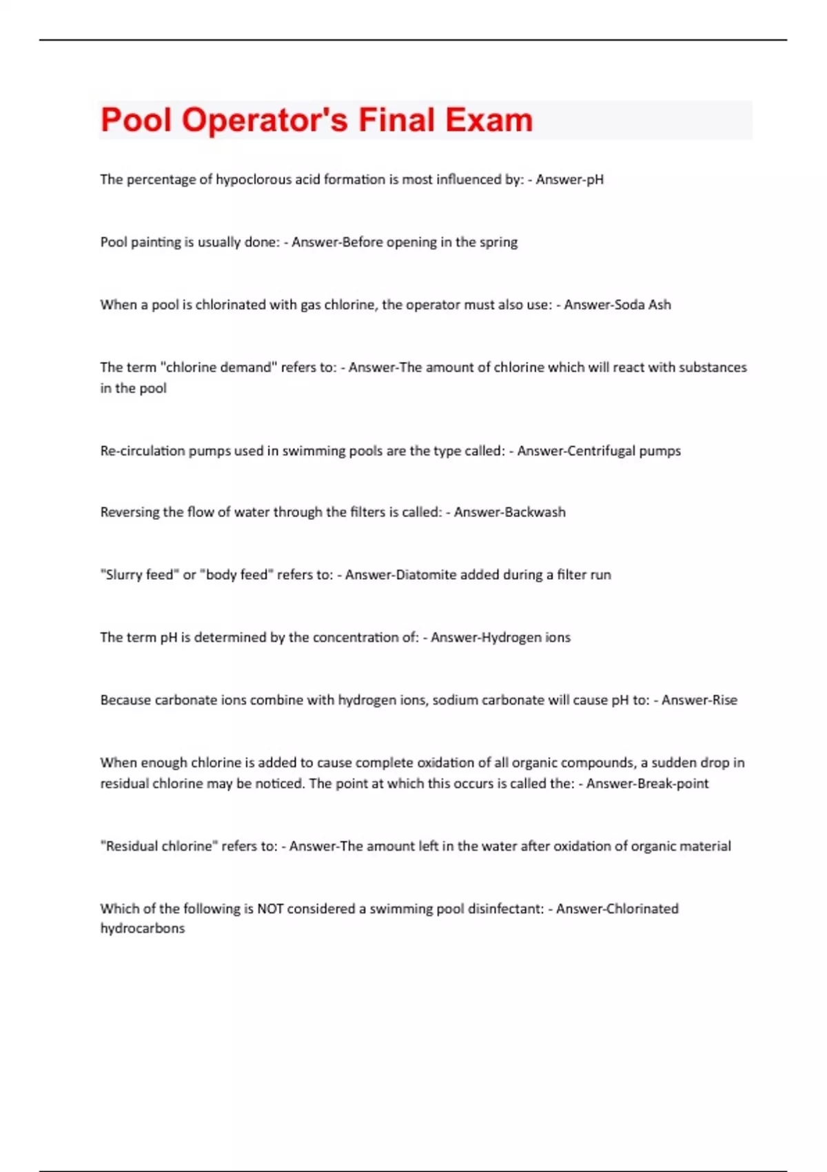Pool Operator's Final Exam Questions & Answers Already Passed!!