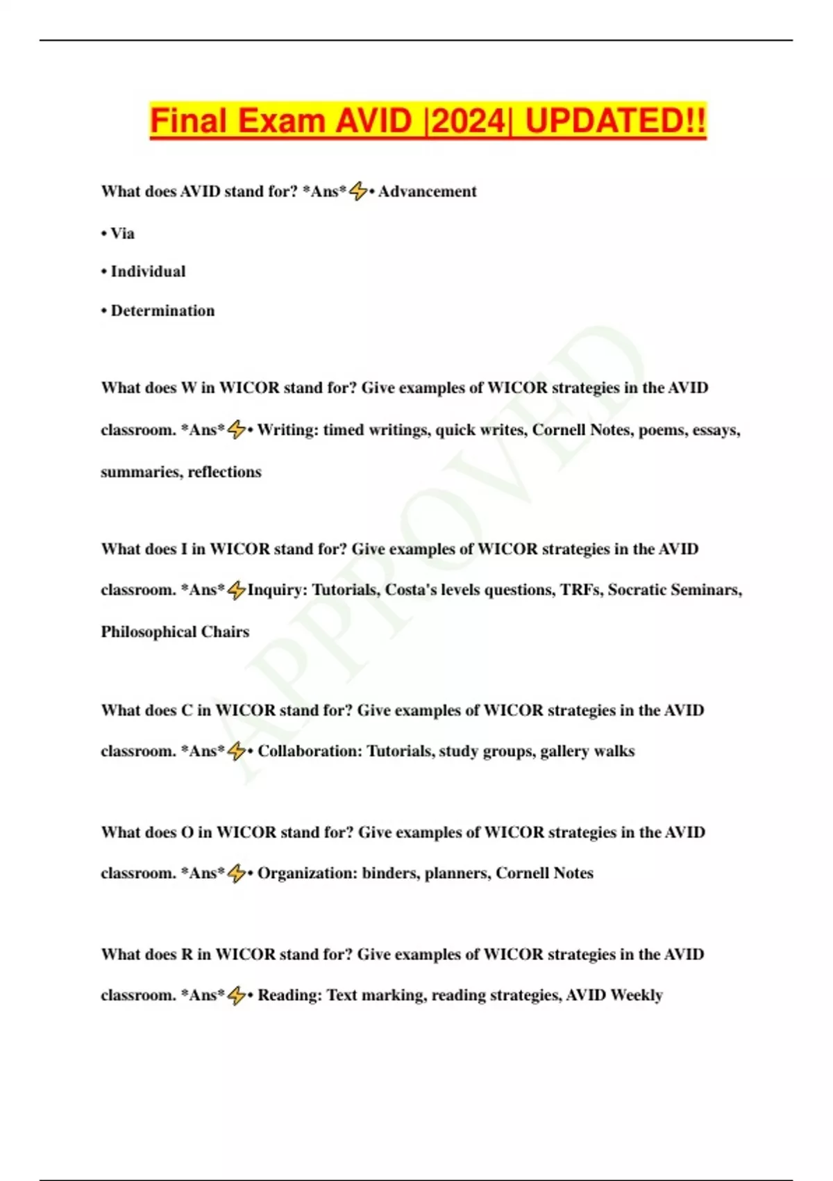 Final Exam AVID |2024| UPDATED!! What does AVID stand for? *Ans* • Advancement • Via • Individual • Determination What does W in WICOR stand for? Give examples of WICOR strategies in the AVID classroom. *Ans* • Writing: timed writings, quick writes, Cornell Notes, poems, essays, summaries, reflections What does I in WICOR stand for? Give examples of WICOR strategies in the AVID classroom. *Ans* Inquiry: Tutorials, Costa's levels questions, TRFs, Socratic Seminars, Philosophical Chairs What does C in WICOR stand for? Give examples of WICOR strategies in the AVID classroom. *Ans* • Collaboration: Tutorials, study groups, gallery walks What does O in WICOR stand for? Give examples of WICOR strategies in the AVID classroom. *Ans* • Organization: binders, planners, Cornell Notes What does R in WICOR stand for? Give examples of WICOR strategies in the AVID classroom. *Ans* • Reading: Text marking, reading strategies, AVID Weekly What are the 10 steps of the AVID tutorial process? *Ans* • 1. Students take Cornell Notes in academic classes • 2. Students complete a TRF (Tutorial Request Reform) • 3. Students turn in a TRF to be checked by the teacher & tutors • 4. Students are divided into groups of 7 or fewer • 5. Tutors & group members ask guiding questions after the student presenter presents their higher level question to the group • 6. Group members ask clarifying questions • 7. Repeat steps 5 & 6 • 8. Students complete a written reflection on their learning • 9. Students turn in their TRF form to be graded • 10. Teacher/tutors/students debrief the tutorial process to verify learning in academic classes. What is a tutorial? *Ans* A collaborative inquiry based activity held every Tuesday and Thursday where students utilize their questioning skills to better understand content from academic classes. Give examples of pre, during, and post-reading strategies. *Ans* • Pre: numbering paragraphs • During: Text marking • Post: Summarizing