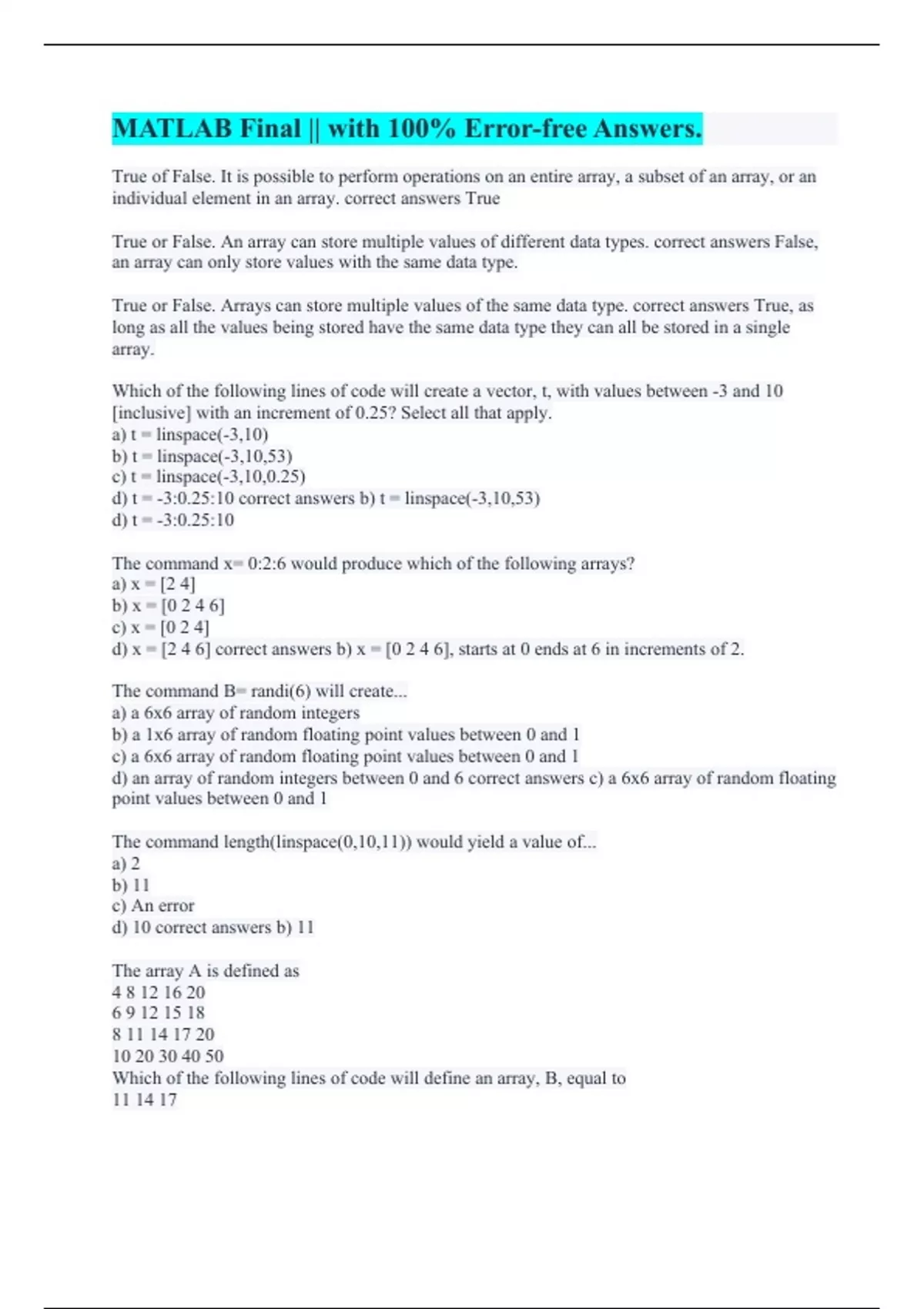 True of False. It is possible to perform operations on an entire array, a subset of an array, or an individual element in an array. correct answers True True or False. An array can store multiple values of different data types. correct answers False, an array can only store values with the same data type. True or False. Arrays can store multiple values of the same data type. correct answers True, as long as all the values being stored have the same data type they can all be stored in a single array. Which of the following lines of code will create a vector, t, with values between -3 and 10 [inclusive] with an increment of 0.25? Select all that apply. a) t = linspace(-3,10) b) t = linspace(-3,10,53) c) t = linspace(-3,10,0.25) d) t = -3:0.25:10 correct answers b) t = linspace(-3,10,53) d) t = -3:0.25:10 The command x= 0:2:6 would produce which of the following arrays? a) x = [2 4] b) x = [0 2 4 6] c) x = [0 2 4] d) x = [2 4 6] correct answers b) x = [0 2 4 6], starts at 0 ends at 6 in increments of 2. The command B= randi(6) will create... a) a 6x6 array of random integers b) a 1x6 array of random floating point values between 0 and 1 c) a 6x6 array of random floating point values between 0 and 1 d) an array of random integers between 0 and 6 correct answers c) a 6x6 array of random floating point values between 0 and 1 The command length(linspace(0,10,11)) would yield a value of... a) 2 b) 11 c) An error d) 10 correct answers b) 11 The array A is defined as Which of the following lines of code will define an array, B, equal to 11 14 17