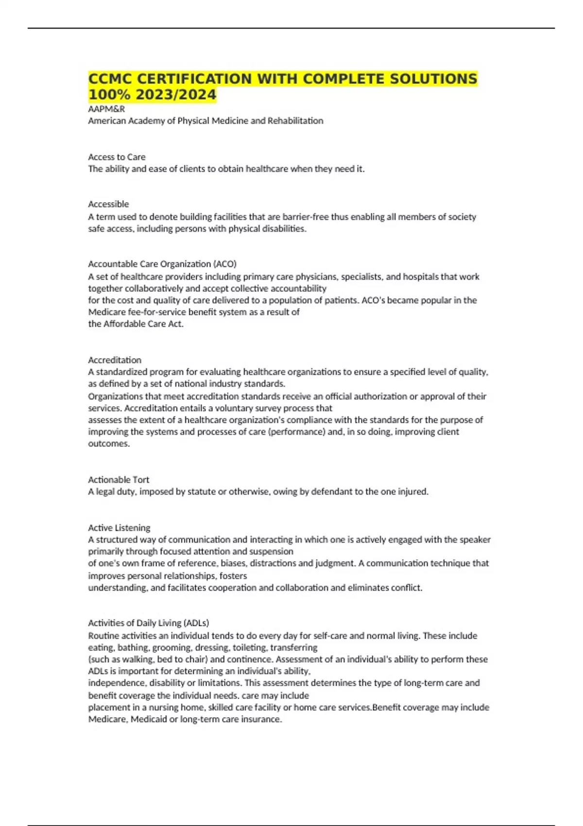 CCMC CERTIFICATION WITH COMPLETE SOLUTIONS 100% 2023/2024 AAPM&R American Academy of Physical Medicine and Rehabilitation Access to Care The ability and ease of clients to obtain healthcare when they need it. Accessible A term used to denote building facilities that are barrier-free thus enabling all members of society safe access, including persons with physical disabilities. Accountable Care Organization (ACO) A set of healthcare providers including primary care physicians, specialists, and hospitals that work together collaboratively and accept collective accountability for the cost and quality of care delivered to a population of patients. ACO's became popular in the Medicare fee-for-service benefit system as a result of the Affordable Care Act. Accreditation A standardized program for evaluating healthcare organizations to ensure a specified level of quality, as defined by a set of national industry standards. Organizations that meet accreditation standards receive an official authorization or approval of their services. Accreditation entails a voluntary survey process that assesses the extent of a healthcare organization's compliance with the standards for the purpose of improving the systems and processes of care (performance) and, in so doing, improving client outcomes. Actionable Tort A legal duty, imposed by statute or otherwise, owing by defendant to the one injured. Active Listening A structured way of communication and interacting in which one is actively engaged with the speaker primarily through focused attention and suspension of one's own frame of reference, biases, distractions and judgment. A communication technique that improves personal relationships, fosters understanding, and facilitates cooperation and collaboration and eliminates conflict. Activities of Daily Living (ADLs) Routine activities an individual tends to do every day for self-care and normal living. These include eating, bathing, grooming, dressing, toileting, transferring (such as walking, bed to chair) and continence. Assessment of an individual's ability to perform these ADLs is important for determining an individual's ability, independence, disability or limitations. This assessment determines the type of long-term care and benefit coverage the individual needs. care may include placement in a nursing home, skilled care facility or home care services.Benefit coverage may include Medicare, Medicaid or long-term care insurance.