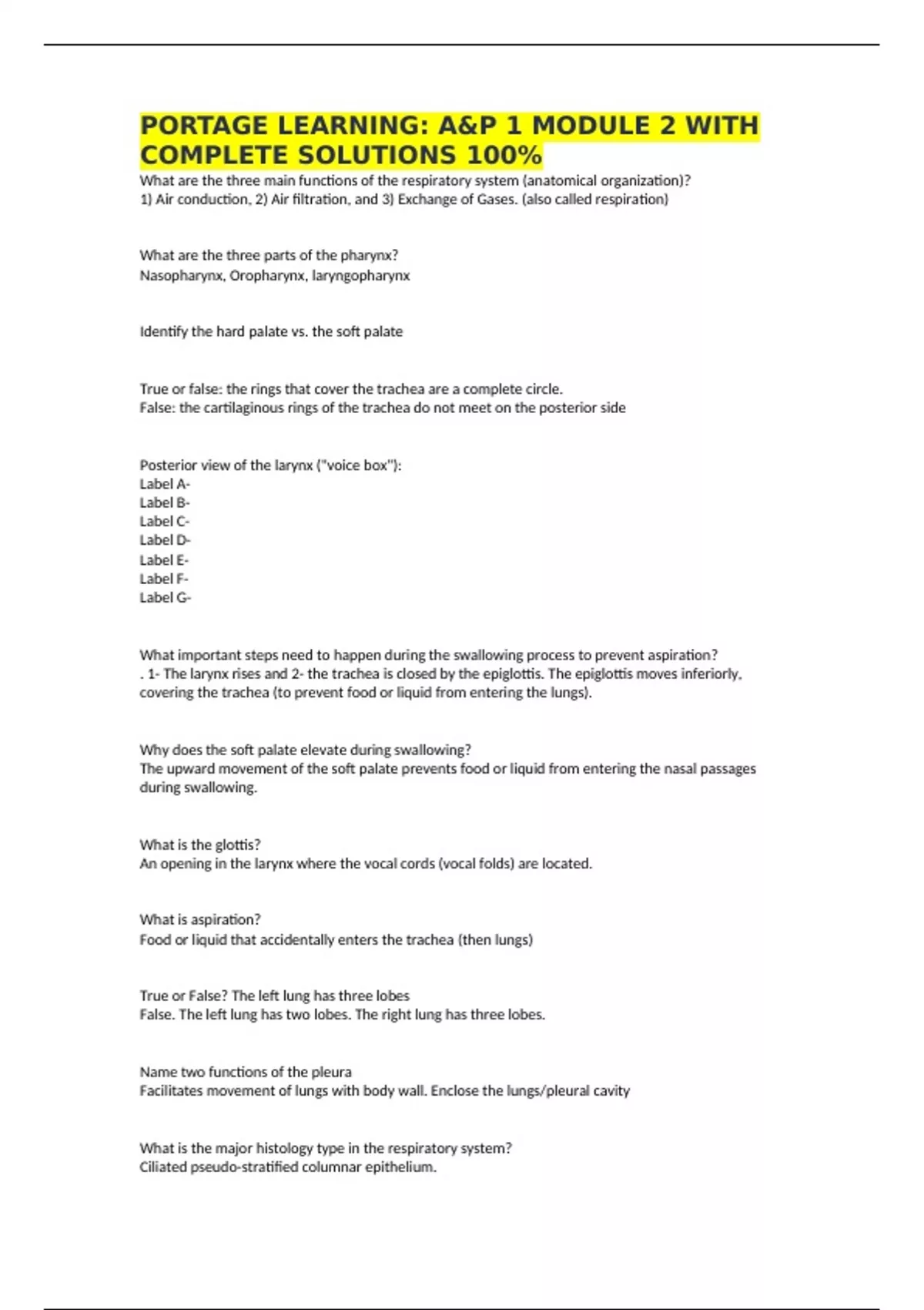PORTAGE LEARNING: A&P 1 MODULE 2 WITH COMPLETE SOLUTIONS 100% What are the three main functions of the respiratory system (anatomical organization)? 1) Air conduction, 2) Air filtration, and 3) Exchange of Gases. (also called respiration) What are the three parts of the pharynx? Nasopharynx, Oropharynx, laryngopharynx Identify the hard palate vs. the soft palate True or false: the rings that cover the trachea are a complete circle. False: the cartilaginous rings of the trachea do not meet on the posterior side Posterior view of the larynx ("voice box"): Label A- Label B- Label C- Label D- Label E- Label F- Label G- What important steps need to happen during the swallowing process to prevent aspiration? . 1- The larynx rises and 2- the trachea is closed by the epiglottis. The epiglottis moves inferiorly, covering the trachea (to prevent food or liquid from entering the lungs). Why does the soft palate elevate during swallowing? The upward movement of the soft palate prevents food or liquid from entering the nasal passages during swallowing. What is the glottis? An opening in the larynx where the vocal cords (vocal folds) are located. What is aspiration? Food or liquid that accidentally enters the trachea (then lungs) True or False? The left lung has three lobes False. The left lung has two lobes. The right lung has three lobes. Name two functions of the pleura Facilitates movement of lungs with body wall. Enclose the lungs/pleural cavity What is the major histology type in the respiratory system? Ciliated pseudo-stratified columnar epithelium.