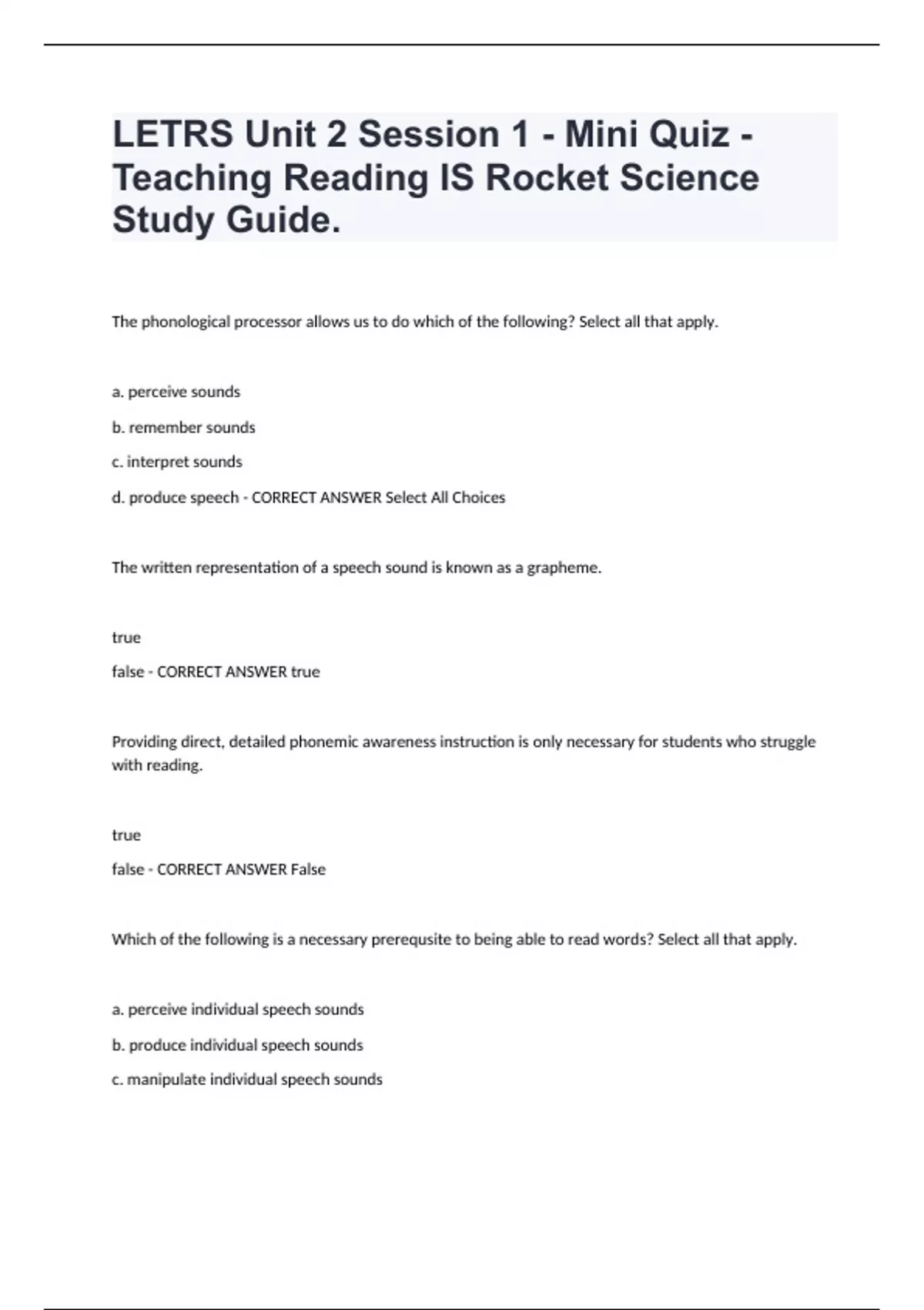 LETRS Unit 2 Session 1 Correctly Answered Questions. The phonological processor allows us to do which of the following? Select all that apply. a. perceive sounds b. remember sounds c. interpret sounds d. produce speech - CORRECT ANSWER Select All Choices The written representation of a speech sound is known as a grapheme. true false - CORRECT ANSWER true Providing direct, detailed phonemic awareness instruction is only necessary for students who struggle with reading. true false - CORRECT ANSWER False