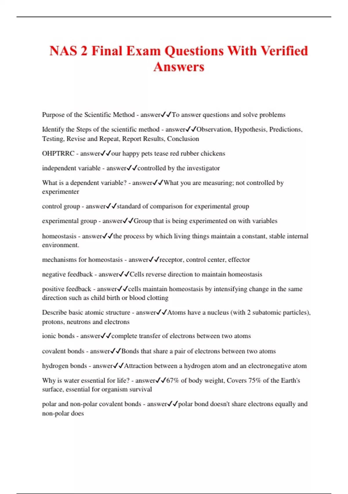 NAS 2 Final Exam Questions With Verified Answers Purpose of the Scientific Method - answerTo answer questions and solve problems Identify the Steps of the scientific method - answerObservation, Hypothesis, Predictions, Testing, Revise and Repeat, Report Results, Conclusion OHPTRRC - answerour happy pets tease red rubber chickens independent variable - answercontrolled by the investigator What is a dependent variable? - answerWhat you are measuring; not controlled by experimenter control group - answerstandard of comparison for experimental group experimental group - answerGroup that is being experimented on with variables homeostasis - answerthe process by which living things maintain a constant, stable internal environment. mechanisms for homeostasis - answerreceptor, control center, effector negative feedback - answerCells reverse direction to maintain homeostasis positive feedback - answercells maintain homeostasis by intensifying change in the same direction such as child birth or blood clotting Describe basic atomic structure - answerAtoms have a nucleus (with 2 subatomic particles), protons, neutrons and electrons ionic bonds - answercomplete transfer of electrons between two atoms covalent bonds - answerBonds that share a pair of electrons between two atoms hydrogen bonds - answerAttraction between a hydrogen atom and an electronegative atom Why is water essential for life? - answer67% of body weight, Covers 75% of the Earth's surface, essential for organism survival polar and non-polar covalent bonds - answerpolar bond doesn't share electrons equally and non-polar does