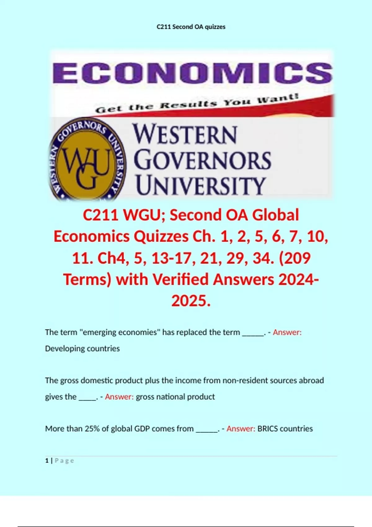 C211 WGU; Second OA Global Economics Quizzes Ch. 1, 2, 5, 6, 7, 10, 11. Ch4, 5, 13-17, 21, 29, 34. (209 Terms) with Verified Answers . Terms like: The term "emerging economies" has replaced the term _____. - Answer: Developing countries