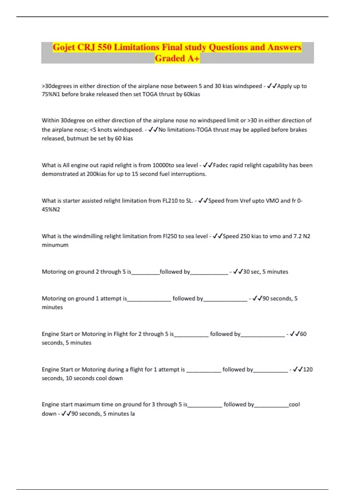 Gojet CRJ 550 Limitations Final study Questions and Answers Graded A+