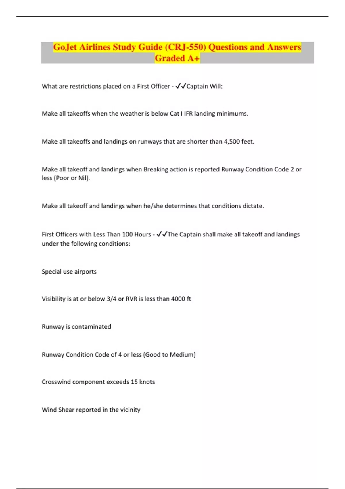 GoJet Airlines Study Guide (CRJ-550) Questions and Answers Graded A+