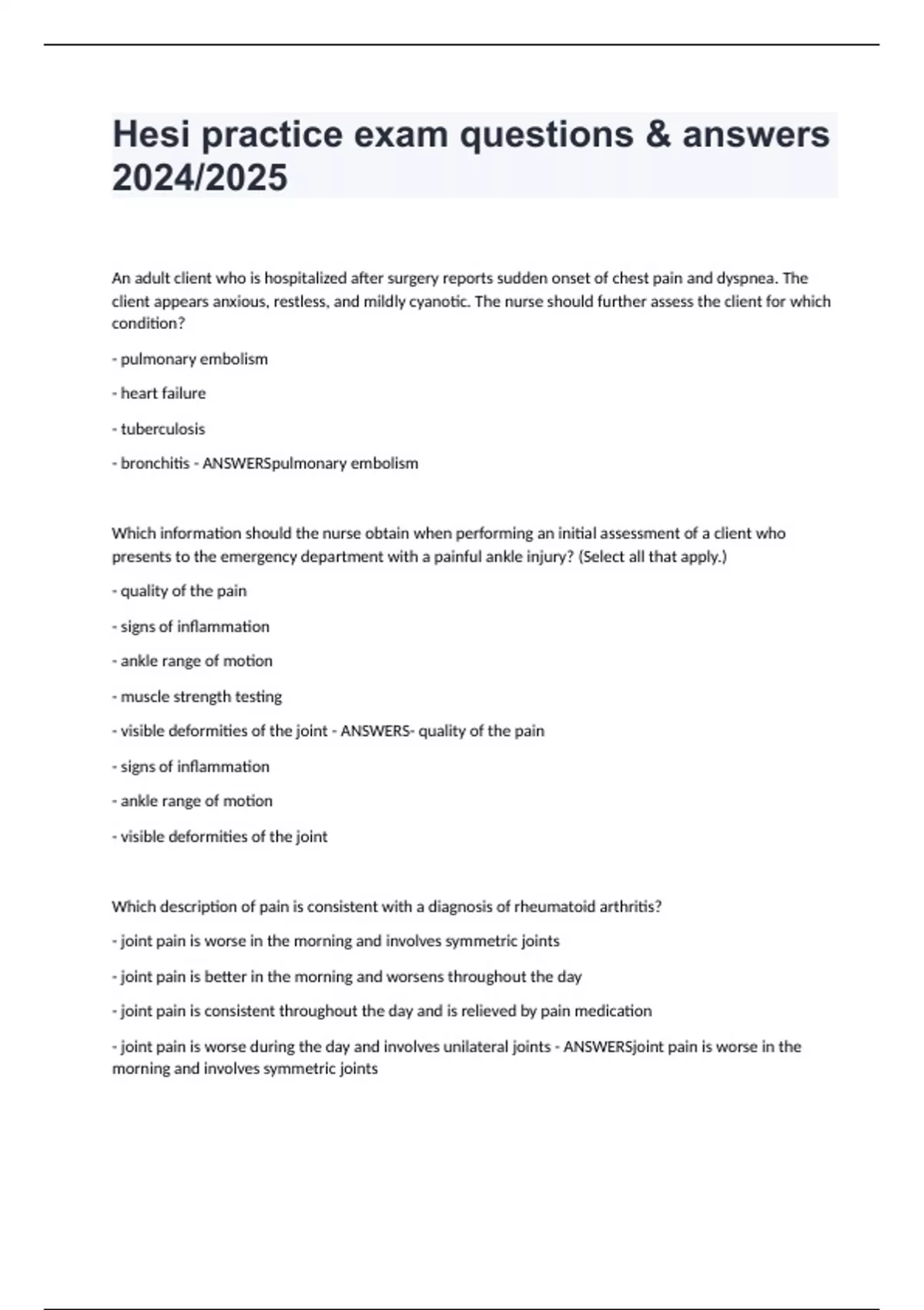 Hesi practice exam questions & answers 2024/2025 An adult client who is hospitalized after surgery reports sudden onset of chest pain and dyspnea. The client appears anxious, restless, and mildly cyanotic. The nurse should further assess the client for which condition? - pulmonary embolism - heart failure - tuberculosis - bronchitis - ANSWERSpulmonary embolism Which information should the nurse obtain when performing an initial assessment of a client who presents to the emergency department with a painful ankle injury? (Select all that apply.) - quality of the pain - signs of inflammation - ankle range of motion - muscle strength testing - visible deformities of the joint - ANSWERS- quality of the pain - signs of inflammation - ankle range of motion - visible deformities of the joint Which description of pain is consistent with a diagnosis of rheumatoid arthritis? - joint pain is worse in the morning and involves symmetric joints - joint pain is better in the morning and worsens throughout the day - joint pain is consistent throughout the day and is relieved by pain medication - joint pain is worse during the day and involves unilateral joints - ANSWERSjoint pain is worse in the morning and involves symmetric joints