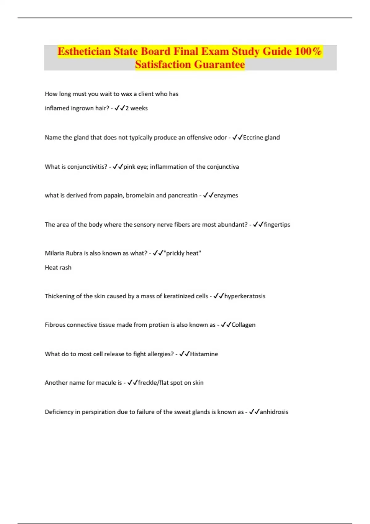 Esthetician State Board Final Exam Study Guide 100% Satisfaction Guarantee