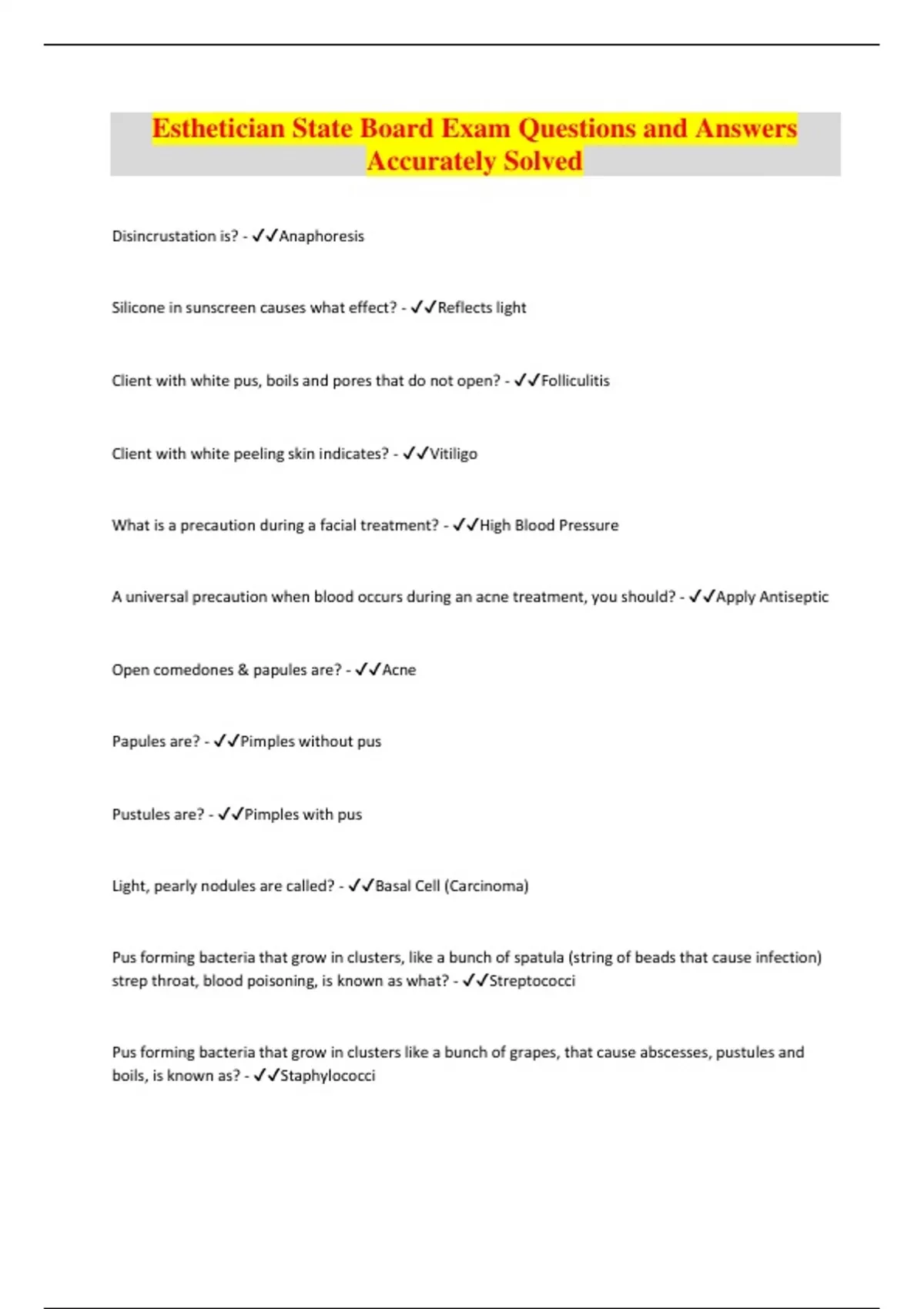 Esthetician State Board Exam Questions and Answers Accurately Solved