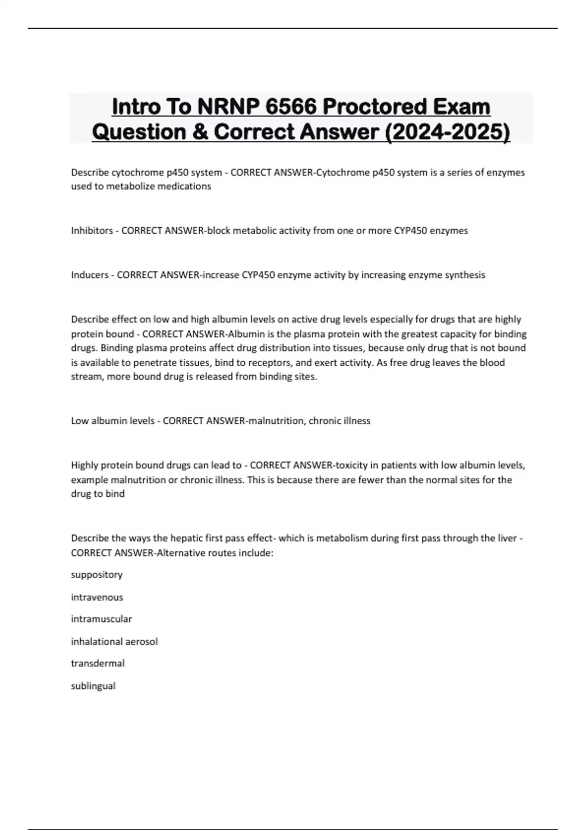 Intro To NRNP 6566 Proctored Exam Question & Correct Answer () Describe cytochrome p450 system - CORRECT ANSWER-Cytochrome p450 system is a series of enzymes used to metabolize medications Inhibitors - CORRECT ANSWER-block metabolic activity from one or more CYP450 enzymes Inducers - CORRECT ANSWER-increase CYP450 enzyme activity by increasing enzyme synthesis Describe effect on low and high albumin levels on active drug levels especially for drugs that are highly protein bound - CORRECT ANSWER-Albumin is the plasma protein with the greatest capacity for binding drugs. Binding plasma proteins affect drug distribution into tissues, because only drug that is not bound is available to penetrate tissues, bind to receptors, and exert activity. As free drug leaves the blood stream, more bound drug is released from binding sites