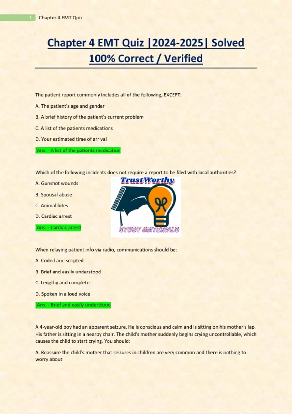 Chapter 4 EMT Quiz || Solved 100% Correct / Verified,Chapter 4 EMT Quiz || Solved 100% Correct / Verified