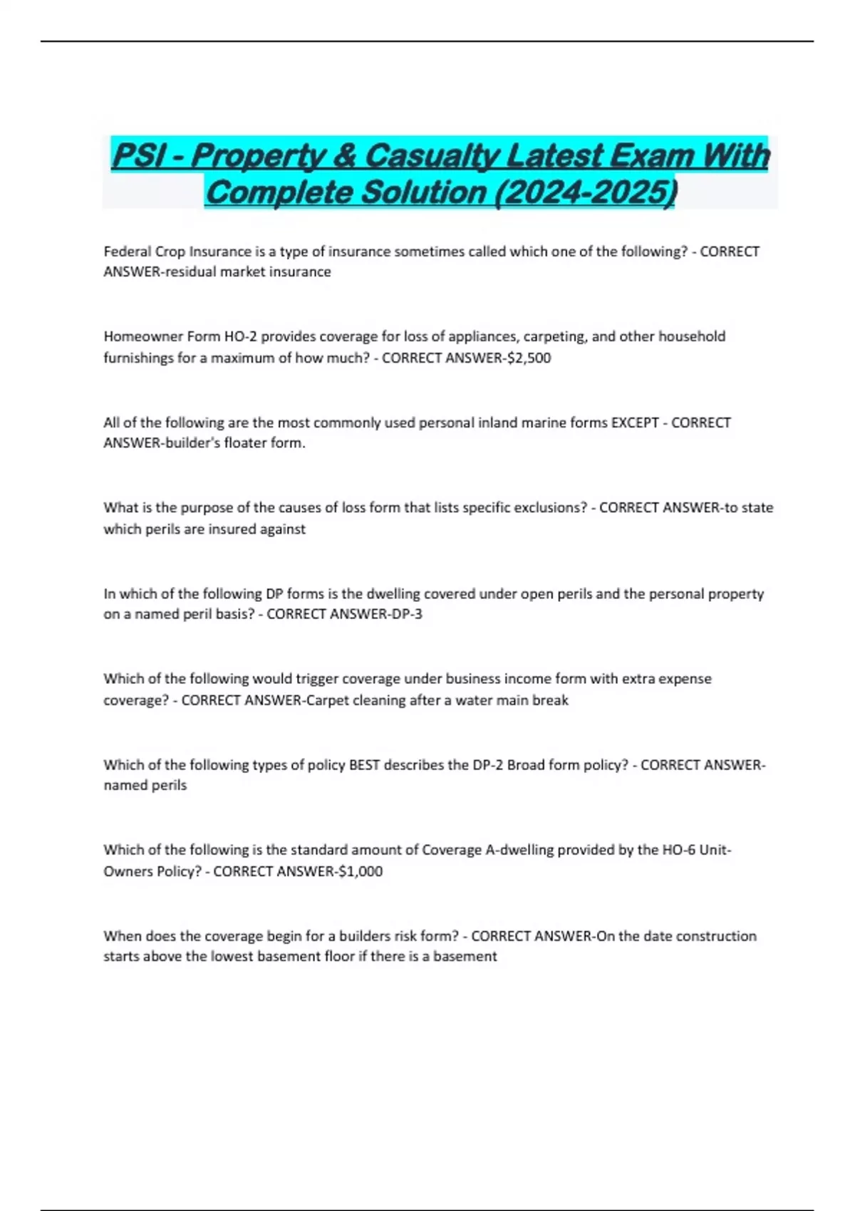 PSI - Property & Casualty Latest Exam With Complete Solution () Federal Crop Insurance is a type of insurance sometimes called which one of the following? - CORRECT ANSWER-residual market insurance Homeowner Form HO-2 provides coverage for loss of appliances, carpeting, and other household furnishings for a maximum of how much? - CORRECT ANSWER-$2,500 All of the following are the most commonly used personal inland marine forms EXCEPT - CORRECT ANSWER-builder's floater form.