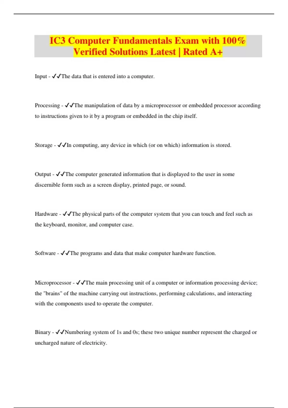 COMPLETED SOLUTION PACK FOR IC3 COMPUTER FUNDAMENTALS {IC3 CERTIFICATION/COMPUTER FUNDAMENTALS/IC3 GS5,GS6} with 100% Verified Solutions | Rated A+