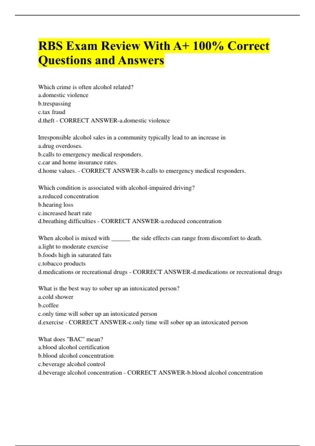 RBS Exam Review With A+ 100% Correct Questions and Answers Which crime is often alcohol related? tic violence assing fraud - CORRECT ANSWER-tic violence Irresponsible alcohol sales in a community typically lead to an increase in overdoses. to emergency medical responders. and home insurance rates. values. - CORRECT ANSWER- to emergency medical responders. Which condition is associated with alcohol-impaired driving? ed concentration ng loss ased heart rate hing difficulties - CORRECT ANSWER-ed concentration When alcohol is mixed with ______ the side effects can range from discomfort to death. to moderate exercise high in saturated fats co products ations or recreational drugs - CORRECT ANSWER-ations or recreational drugs What is the best way to sober up an intoxicated person? shower e time will sober up an intoxicated person ise - CORRECT ANSWER- time will sober up an intoxicated person What does "BAC" mean? alcohol certification alcohol concentration age alcohol control age alcohol concentration - CORRECT ANSWER- alcohol concentration A person may experience very harmful effects when mixing alcohol with ations. ine. foods. ine. - CORRECT ANSWER-ations. Eating food while drinking alcohol may less of the alcohol to be metabolized. the body to purge the alcohol from the blood stream. the diner from becoming intoxicated. down the rate of intoxication. - CORRECT ANSWER- down the rate of intoxication. Which physical characteristic behavior is an indication that a patron might be obviously intoxicated? ased alertness ng very fast and deliberate movements , non-watery eyes - CORRECT ANSWER- and deliberate movements