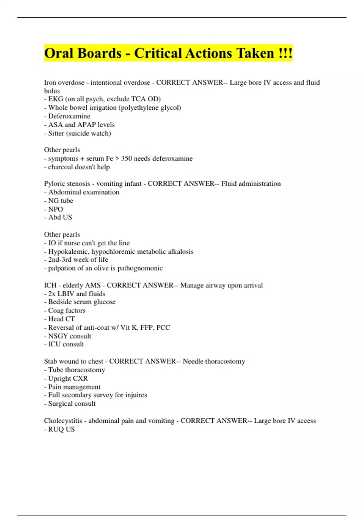 Oral Boards - Critical Actions Taken !!! Iron overdose - intentional overdose - CORRECT ANSWER-- Large bore IV access and fluid bolus - EKG (on all psych, exclude TCA OD) - Whole bowel irrigation (polyethylene glycol) - Deferoxamine - ASA and APAP levels - Sitter (suicide watch) Other pearls - symptoms + serum Fe > 350 needs deferoxamine - charcoal doesn't help Pyloric stenosis - vomiting infant - CORRECT ANSWER-- Fluid administration - Abdominal examination - NG tube - NPO - Abd US Other pearls - IO if nurse can't get the line - Hypokalemic, hypochloremic metabolic alkalosis - 2nd-3rd week of life - palpation of an olive is pathognomonic ICH - elderly AMS - CORRECT ANSWER-- Manage airway upon arrival - 2x LBIV and fluids - Bedside serum glucose - Coag factors - Head CT - Reversal of anti-coat w/ Vit K, FFP, PCC - NSGY consult - ICU consult Stab wound to chest - CORRECT ANSWER-- Needle thoracostomy - Tube thoracostomy - Upright CXR - Pain management - Full secondary survey for injuires - Surgical consult Cholecystitis - abdominal pain and vomiting - CORRECT ANSWER-- Large bore IV access - RUQ US - Pain management - Surgery consultation - Antibiotics Neonatal sepsis - weak infant, poor feeding - CORRECT ANSWER-- IV/IO access - multiple fluid boluses - early abx - ICU consult - LP can be deferred until hemodynamically stable - intubation if lethargy not improving Boerhaave syndrome - chest pain - CORRECT ANSWER-- Note crepitus on physical exam - consider esophageal tear in ddx - CXR to evaluate lungs and mediastinum - Emergent GI, ENT, or CT surgeon consult - Fluid resuscitation - Broad spectrum antibiotics Epidural abscess - back pain - CORRECT ANSWER-- Consider dx in patient w/ back pain and fever - obtain rectal temp - obtain stat imaging - NSGY consult - Determine cause 2/2 UTI Necrotizing fasciitis - Leg swelling - CORRECT ANSWER-- Early recognition of sepsis and tx - Aggressive IVF - IV abx - Immediate surgical consult - Insistence on evaluation due to need for debridement Hyperkalemia/ARF - weakness, CP/SOB - CORRECT ANSWER-- EKG - Note hyperkalemia - Calcium administration - The rest of the cocktail, they weren't too specific, just shifters AND depleters - Admission Acute angle closure glaucoma - blurry, painful vision - CORRECT ANSWER-- Thorough eye examination: EOM, pupils, visual acuity, slit lamp, IOP, conjunctiva, fundoscopic - Early administration of meds: timolol, brimonidine, acetazolamide (not in sicklers), mannitol, prednisolone, and pilocarpine once IOP < 40 - Frequent administration until IOP normalizes - Emergent ophthalmology consult Strangulated hernia - abdominal pain and vomiting - CORRECT ANSWER-- Recognition of hernia - Large bore IV access - upright CXR w/ obstructive series - NG tube placement - pain management - Surgery consult ASA toxicity - unintentional OD - CORRECT ANSWER-- Large bore IV access - Pregnancy test - Obtain history of ASA use - Alkalization of urine w/ bicarb bolus and drip - Close monitoring of patient and salicylate levels - ICU admission - (poison control call can't hurt, but wasn't on there) Henoch-Schonlein Purpura - vomiting child - CORRECT ANSWER-- Fluid resuscitation - upright CXR w/ obs series (but no US???) - Pain mgmt - Lab eval of liver and renal injury - Pedi surgery consult snake bite - CORRECT ANSWER-- Assess ABC's - Assess wound thoroughly - Identify snake, risk for venom exposure - Evaluate for lab signs of envenomation - Observe in the ER for physical signs of envenomation - Thorough history and full physical exam including total skin exposure - Contact Poison Control for guidance Vision loss - CRVO - CORRECT ANSWER-- Full ocular exam - VA, EOM, pupils, conjunctiva, slit lamp, ocular pressures, fundoscopy - Ophthalmology consult Pearls: - Optic disc edema and diffuse retinal hemorrhages in all quadrants are pathognomonic for central retinal vein occlusion. - May. or may not have an APD syncope - prolonged QT syndrome > Torsade de Pointes - CORRECT ANSWER-- EKG ordered, recognition of prolonged QT syndrome - Recognition of TdP on. monitor - Resuscitation. per PALS (chest compressions, intubation, magnesium) - Cardiology. consultation sore throat - RPA - CORRECT ANSWER-- Prepare for intubation - antibiotics - soft tissue neck radiograph