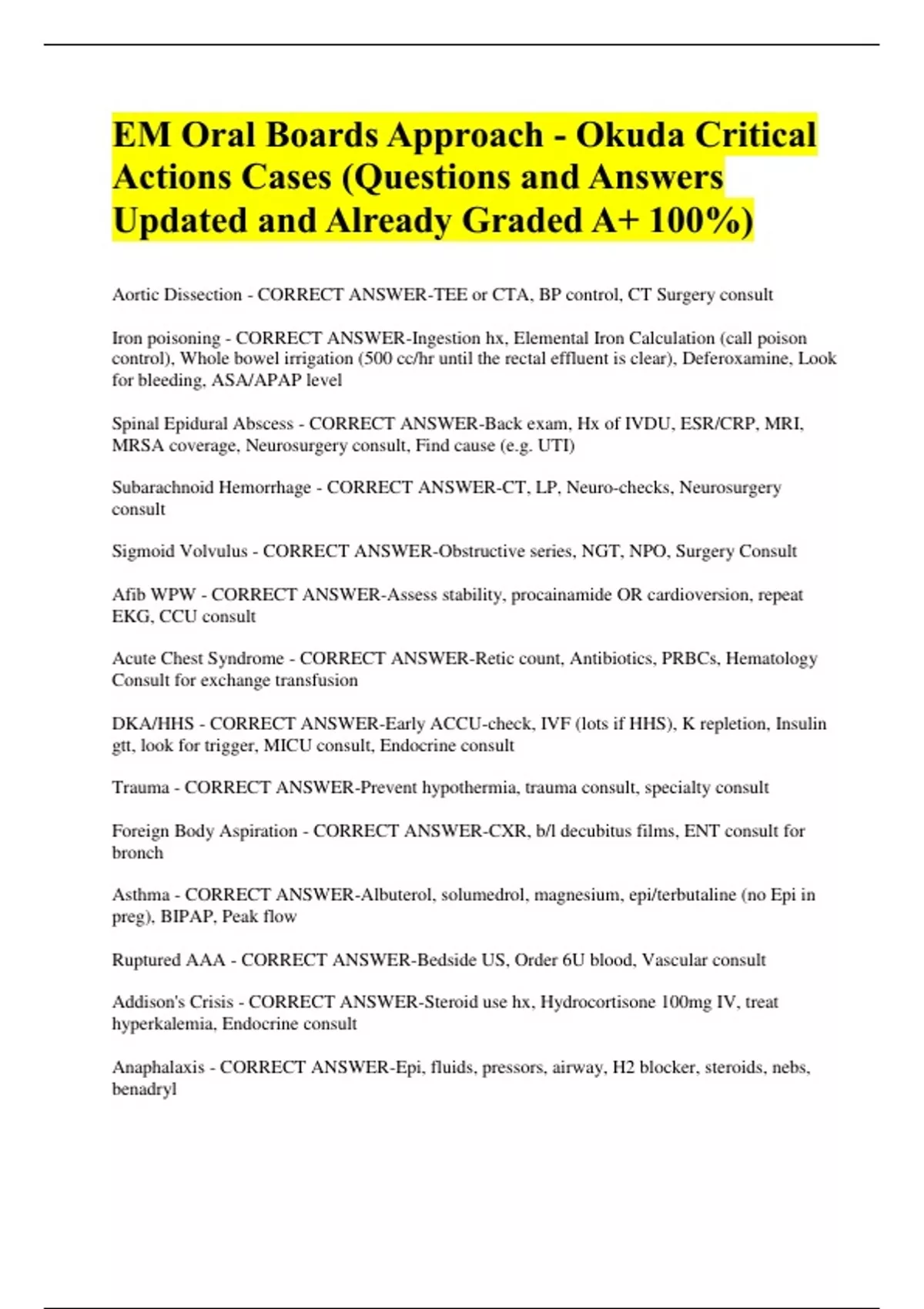 EM Oral Boards Approach - Okuda Critical Actions Cases (Questions and Answers Updated and Already Graded A+ 100%) Aortic Dissection - CORRECT ANSWER-TEE or CTA, BP control, CT Surgery consult Iron poisoning - CORRECT ANSWER-Ingestion hx, Elemental Iron Calculation (call poison control), Whole bowel irrigation (500 cc/hr until the rectal effluent is clear), Deferoxamine, Look for bleeding, ASA/APAP level Spinal Epidural Abscess - CORRECT ANSWER-Back exam, Hx of IVDU, ESR/CRP, MRI, MRSA coverage, Neurosurgery consult, Find cause (e.g. UTI) Subarachnoid Hemorrhage - CORRECT ANSWER-CT, LP, Neuro-checks, Neurosurgery consult Sigmoid Volvulus - CORRECT ANSWER-Obstructive series, NGT, NPO, Surgery Consult Afib WPW - CORRECT ANSWER-Assess stability, procainamide OR cardioversion, repeat EKG, CCU consult Acute Chest Syndrome - CORRECT ANSWER-Retic count, Antibiotics, PRBCs, Hematology Consult for exchange transfusion DKA/HHS - CORRECT ANSWER-Early ACCU-check, IVF (lots if HHS), K repletion, Insulin gtt, look for trigger, MICU consult, Endocrine consult Trauma - CORRECT ANSWER-Prevent hypothermia, trauma consult, specialty consult Foreign Body Aspiration - CORRECT ANSWER-CXR, b/l decubitus films, ENT consult for bronch Asthma - CORRECT ANSWER-Albuterol, solumedrol, magnesium, epi/terbutaline (no Epi in preg), BIPAP, Peak flow Ruptured AAA - CORRECT ANSWER-Bedside US, Order 6U blood, Vascular consult Addison's Crisis - CORRECT ANSWER-Steroid use hx, Hydrocortisone 100mg IV, treat hyperkalemia, Endocrine consult Anaphalaxis - CORRECT ANSWER-Epi, fluids, pressors, airway, H2 blocker, steroids, nebs, benadryl In pediatrics: - Benadryl 1 mg/kg IV - Epi 1:1000 0.01 mg/kg IM (thigh) - Solumedrol 1 mg/kg IV - Ranitidine 1 mg/kg IV - Albuterol 2.5g in NS nebulizer - Epi gtt 1 mcg/kg/min - Racemic Epi 2.25% in NS nebulized ASA OD - CORRECT ANSWER-ASA levels q1hr, Charcoal, aggressive IVF, Bicarb 1 mEq/kg, then gtt (3 amp bicarb in 1L D5W @ 2 mL/kg/hr goal serum pH 7.5-7.6), Replace K 20 mEq IV, goal UOP 1 cc/kg/hr, Dialysis, treat hypoglycemia, Cause of ASA OD (septic joint etc), CT head, Call poison control Burn/CO poisoning - CORRECT ANSWER-Intubate (if oral soot), TBSA, Parkland (TBSA x kg x 4 = given 1/2 in 8hrs), hyperbaric, wound care, tetanus CHF exacerbation - CORRECT ANSWER-Nitro gtt, BiPAP, lasix, ASA Cocaine Packer - CORRECT ANSWER-Intubate early, benzos for abnormal VS, GI decontamination, Surgery Consult Pre-Enclampsia/Eclampsia/HELLP - CORRECT ANSWER-Magnesium 2-6g for seizure (then 1 g/hr), Fetal monitor/bedside US, Emergent C-section, OB consult, Labetalol/Hydralazine, Platelet transfusion if <20, Decadron 6mg IM for lung maturity if less 36 weeks Ruptured Ectopic Pregnancy - CORRECT ANSWER-Urine pregnancy, Bedside FAST, Call OB, Rhogam, T&C Epiglottitis - CORRECT ANSWER-- Humidified O2, DL + Cric kit at bedside, ENT/Anesthesia for emergent intubation, Neck XR to diagnose epiglottitis, + Abx (kid goes straight to OR, do not disturb) - Surgical Cric procedure if > 7 yo, otherwise needle cric. (quick sterile prep, palpate cricothyroid membrane, skin incision, incise membrane, place bougie, pass tube over bougie, and confirm placement) TCA overdose - CORRECT ANSWER-Charcoal, Bicarb, ICU consult, Psych consult, 1:1 Tylenol OD - CORRECT ANSWER-Charcoal, NAC, ICU consult, Psych consult, 1:1 STEMI - CORRECT ANSWER-ASA, plavix, heparin, reperfusion therapy Pediatric Sepsis - CORRECT ANSWER-Urine/blood/CSF studies, early abx, pressor Hypercalcemia - CORRECT ANSWER-NS 500 mL/hr, Furosemide, Hydrocortisone 100mg
