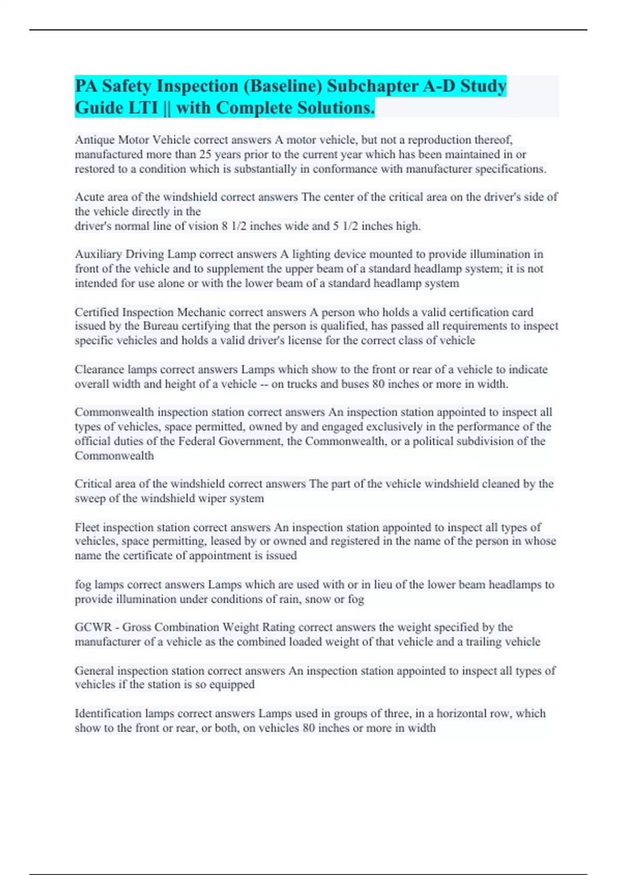 PA Safety Inspection (Baseline) Subchapter A-D Study Guide LTI || with Complete Solutions.