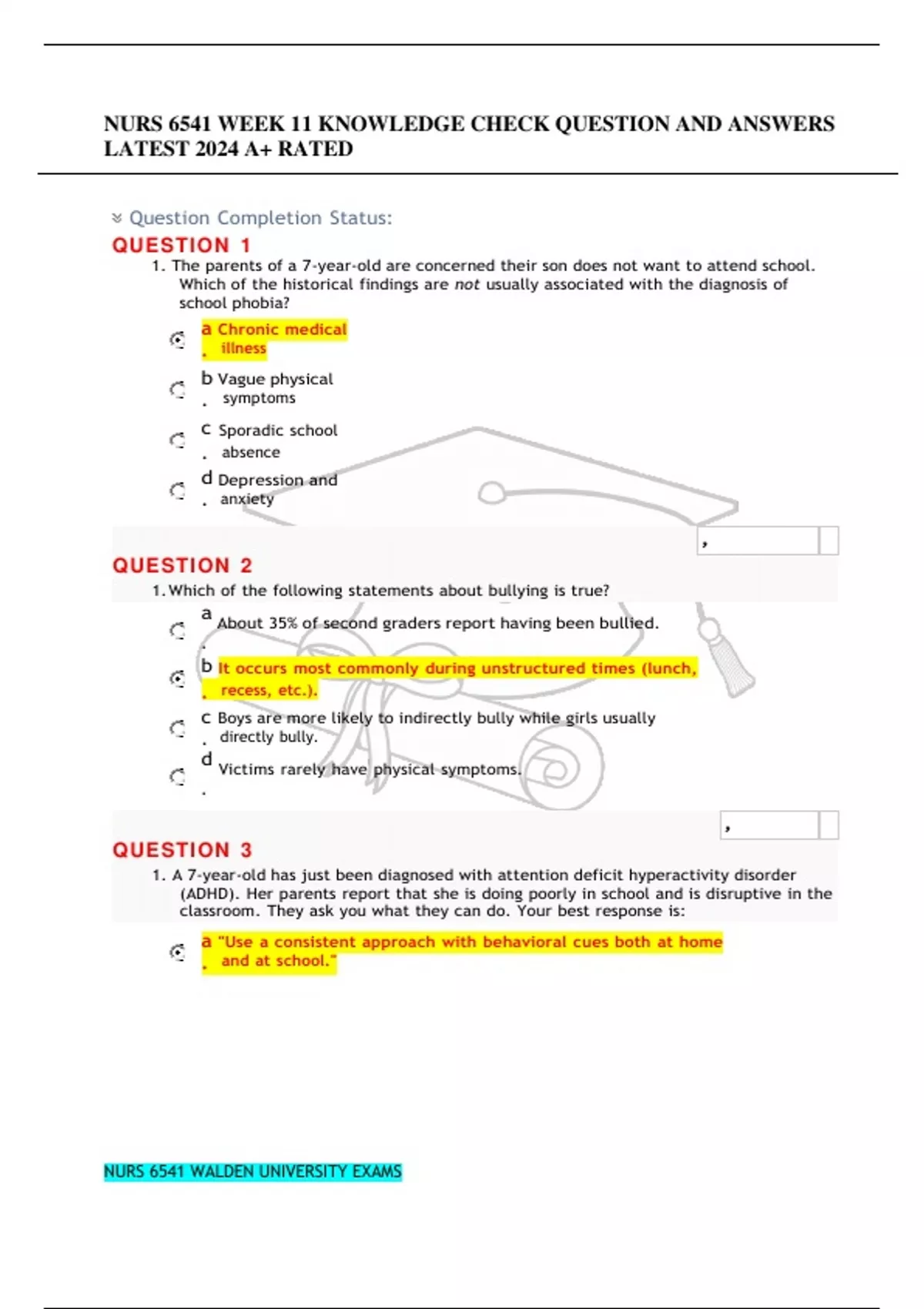 NURS 6541 WEEK 11 KNOWLEDGE CHECK QUESTION AND ANSWERS LATEST 2024 A+ RATED QUESTION 1 1. The parents of a 7-year-old are concerned their son does not want to attend school. Which of the historical findings are not usually associated with the diagnosis of school phobia?