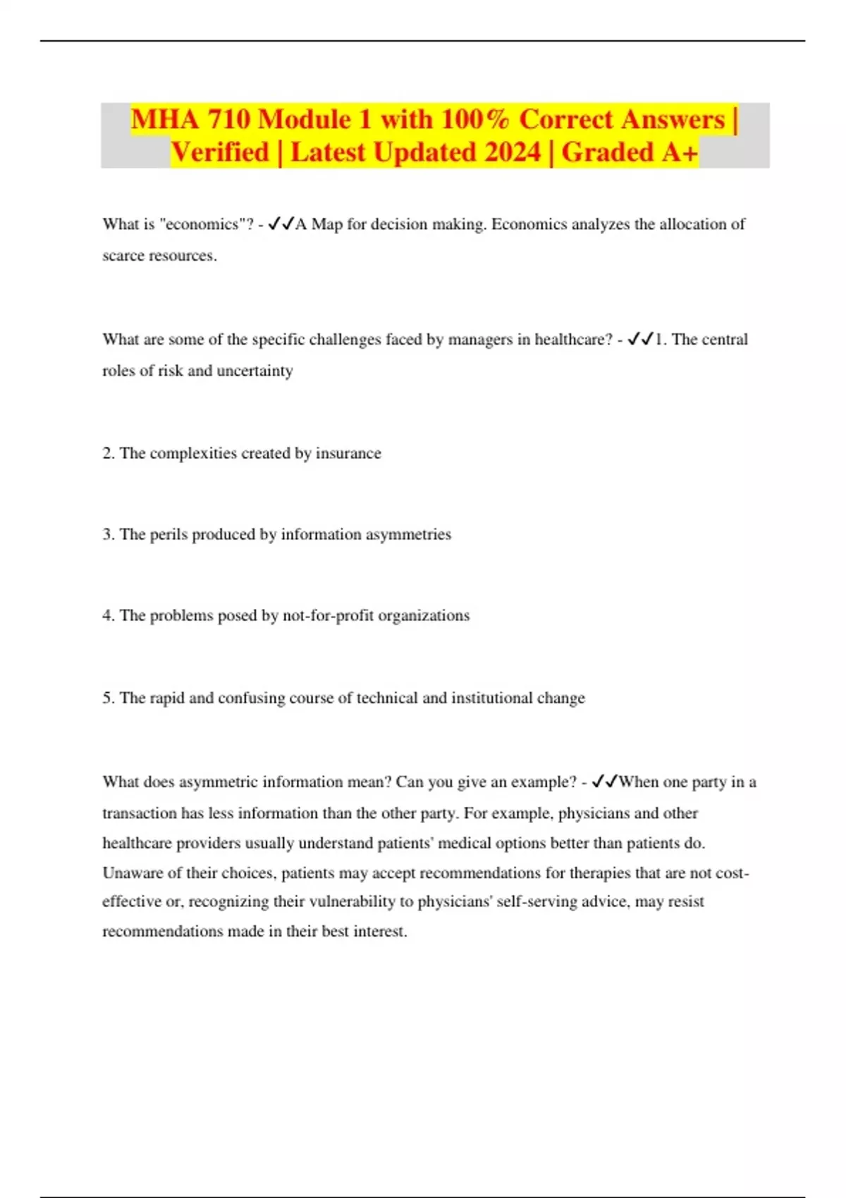 Package deal information:: MHA 710 Exams with 100% Correct Answers | Verified | Latest Updated 2024 | Graded A+