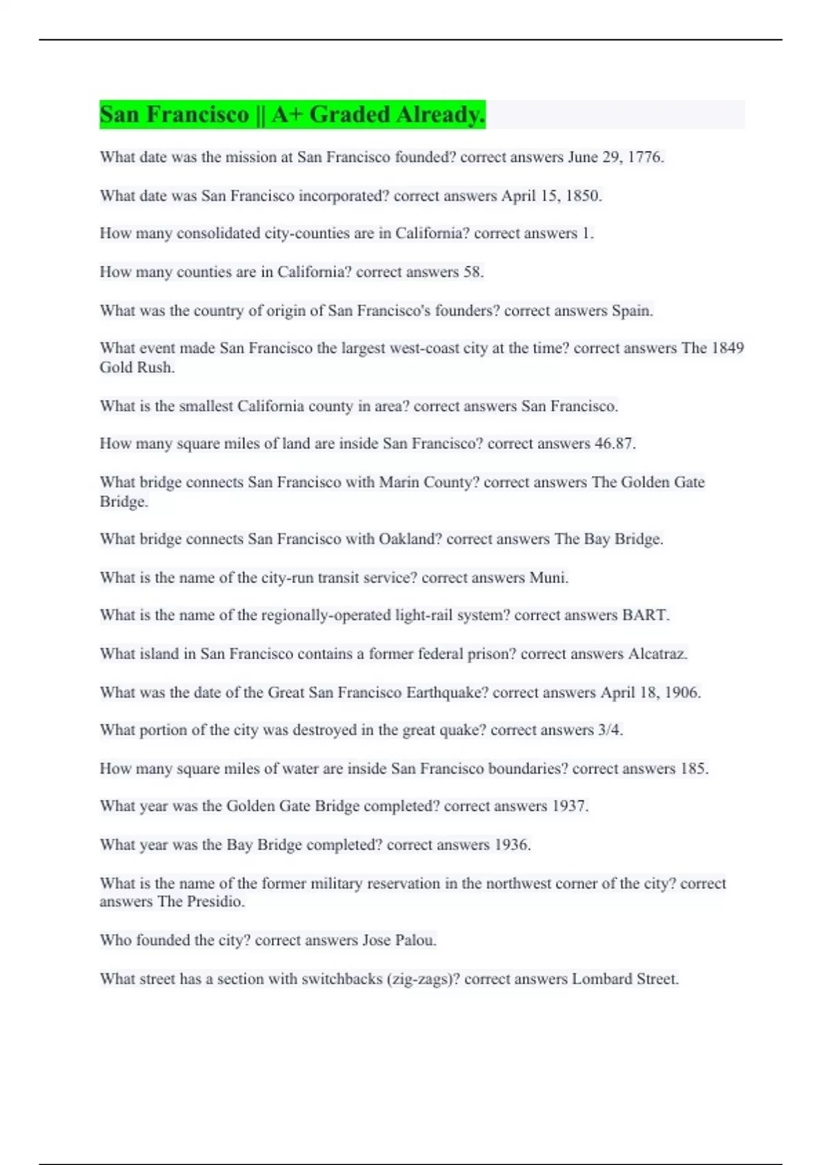 What date was the mission at San Francisco founded? correct answers June 29, 1776. What date was San Francisco incorporated? correct answers April 15, 1850. How many consolidated city-counties are in California? correct answers 1. How many counties are in California? correct answers 58. What was the country of origin of San Francisco's founders? correct answers Spain. What event made San Francisco the largest west-coast city at the time? correct answers The 1849 Gold Rush. What is the smallest California county in area? correct answers San Francisco. How many square miles of land are inside San Francisco? correct answers 46.87. What bridge connects San Francisco with Marin County? correct answers The Golden Gate Bridge. What bridge connects San Francisco with Oakland? correct answers The Bay Bridge. What is the name of the city-run transit service? correct answers Muni. What is the name of the regionally-operated light-rail system? correct answers BART. What island in San Francisco contains a former federal prison? correct answers Alcatraz. What was the date of the Great San Francisco Earthquake? correct answers April 18, 1906. What portion of the city was destroyed in the great quake? correct answers 3/4. How many square miles of water are inside San Francisco boundaries? correct answers 185. What year was the Golden Gate Bridge completed? correct answers 1937. What year was the Bay Bridge completed? correct answers 1936. What is the name of the former military reservation in the northwest corner of the city? correct answers The Presidio. Who founded the city? correct answers Jose Palou. What street has a section with switchbacks (zig-zags)? correct answers Lombard Street.
