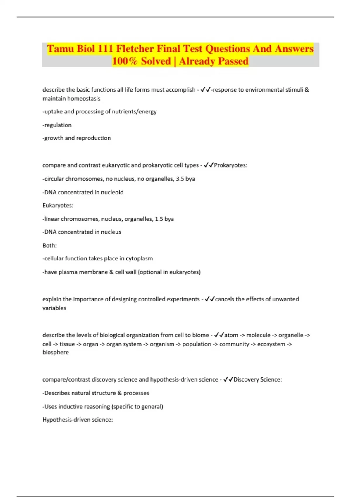 Tamu Biol 111 Fletcher Final Test Questions And Answers 100% Solved | Already Passed