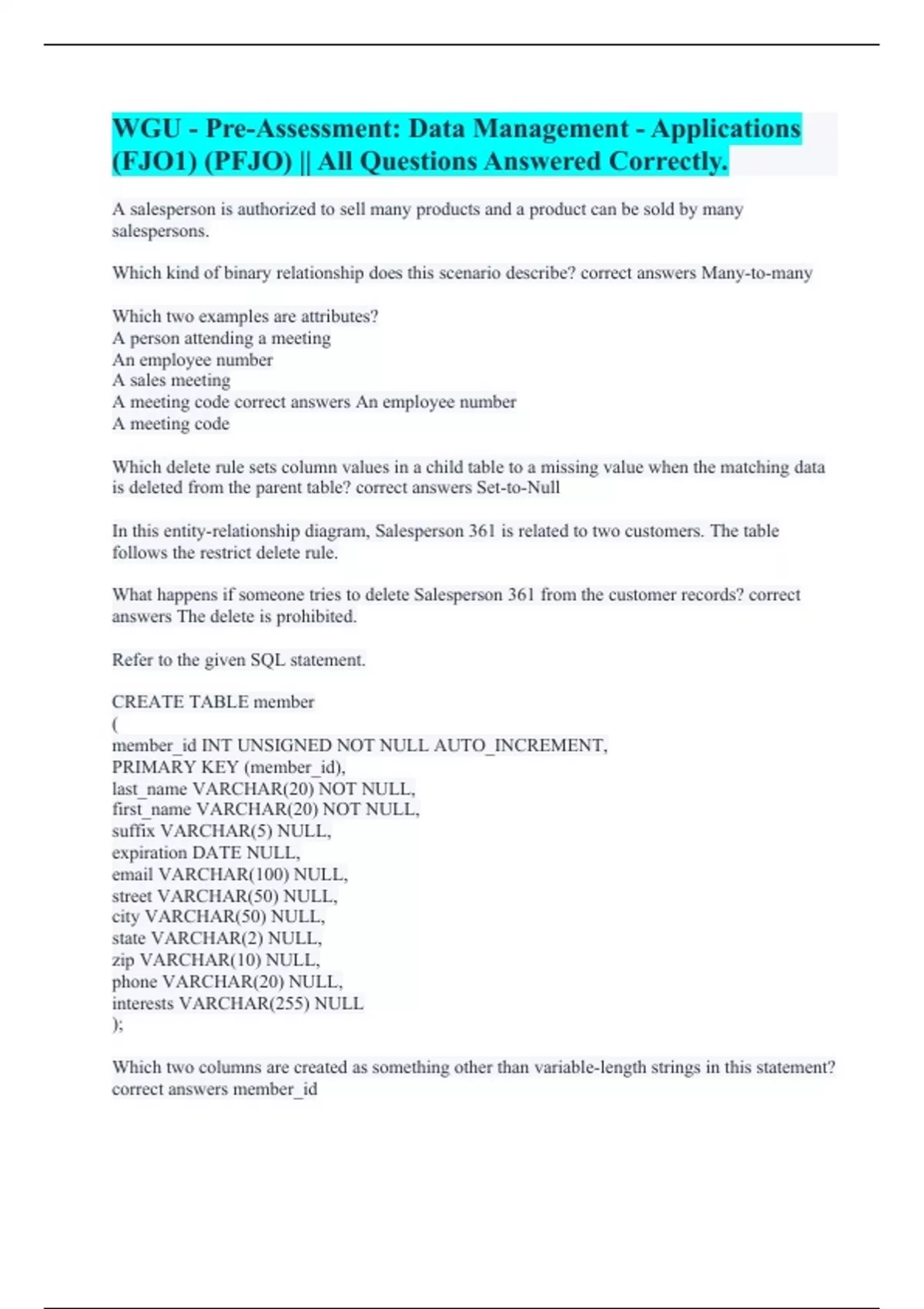 A salesperson is authorized to sell many products and a product can be sold by many salespersons. Which kind of binary relationship does this scenario describe? correct answers Many-to-many Which two examples are attributes? A person attending a meeting An employee number A sales meeting A meeting code correct answers An employee number A meeting code Which delete rule sets column values in a child table to a missing value when the matching data is deleted from the parent table? correct answers Set-to-Null In this entity-relationship diagram, Salesperson 361 is related to two customers. The table follows the restrict delete rule. What happens if someone tries to delete Salesperson 361 from the customer records? correct answers The delete is prohibited. Refer to the given SQL statement. CREATE TABLE member ( member_id INT UNSIGNED NOT NULL AUTO_INCREMENT, PRIMARY KEY (member_id), last_name VARCHAR(20) NOT NULL, first_name VARCHAR(20) NOT NULL, suffix VARCHAR(5) NULL, expiration DATE NULL, email VARCHAR(100) NULL, street VARCHAR(50) NULL, city VARCHAR(50) NULL, state VARCHAR(2) NULL, zip VARCHAR(10) NULL, phone VARCHAR(20) NULL, interests VARCHAR(255) NULL ); Which two columns are created as something other than variable-length strings in this statement? correct answers member_id