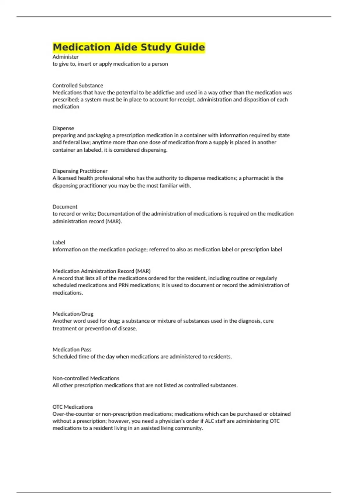 Medication Aide Study Guide Administer to give to, insert or apply medication to a person Controlled Substance Medications that have the potential to be addictive and used in a way other than the medication was prescribed; a system must be in place to account for receipt, administration and disposition of each medication Dispense preparing and packaging a prescription medication in a container with information required by state and federal law; anytime more than one dose of medication from a supply is placed in another container an labeled, it is considered dispensing. Dispensing Practitioner A licensed health professional who has the authority to dispense medications; a pharmacist is the dispensing practitioner you may be the most familiar with. Document to record or write; Documentation of the administration of medications is required on the medication administration record (MAR). Label Information on the medication package; referred to also as medication label or prescription label Medication Administration Record (MAR) A record that lists all of the medications ordered for the resident, including routine or regularly scheduled medications and PRN medications; It is used to document or record the administration of medications. Medication/Drug Another word used for drug; a substance or mixture of substances used in the diagnosis, cure treatment or prevention of disease. Medication Pass Scheduled time of the day when medications are administered to residents. Non-controlled Medications All other prescription medications that are not listed as controlled substances. OTC Medications Over-the-counter or non-prescription medications; medications which can be purchased or obtained without a prescription; however, you need a physician's order if ALC staff are administering OTC medications to a resident living in an assisted living community.