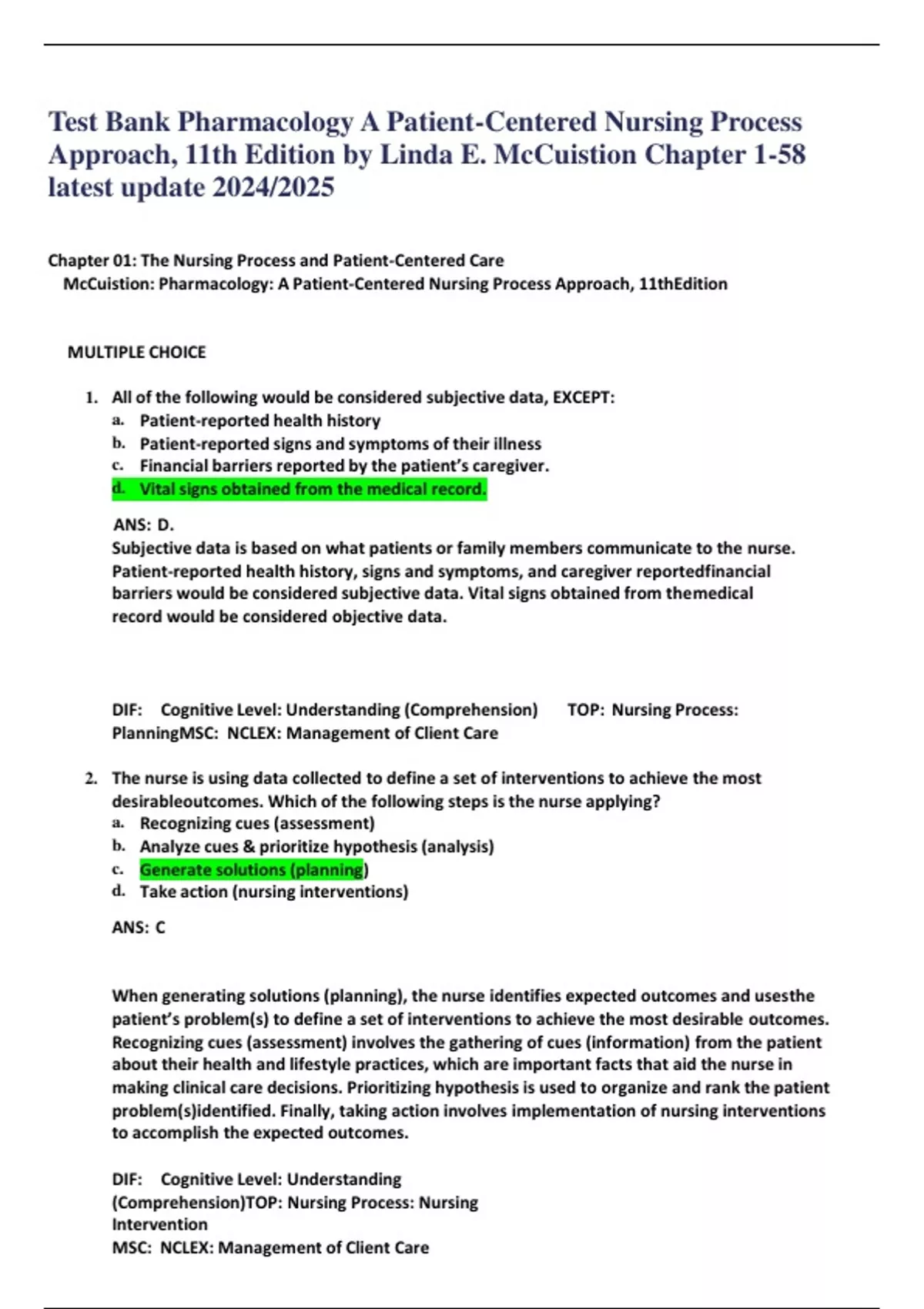 Test Bank Pharmacology A Patient-Centered Nursing Process Approach, 11th Edition by Linda E. McCuistion Chapter 1-58 latest update 2024/2025