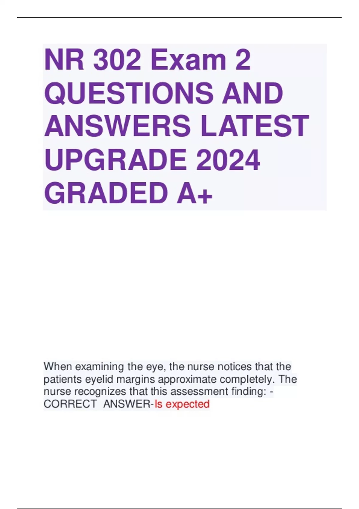 NR 302 Exam 2 QUESTIONS AND ANSWERS LATEST UPGRADE 2024 GRADED A+ When examining the eye, the nurse notices that the patients eyelid margins approximate completely. The nurse recognizes that this assessment finding: - CORRECT ANSWER-Is expected - The palpebral fissure is the elliptical open space between the eyelids, and, when closed, the lid margins approximate completely, which is a normal finding. During ocular examinations, the nurse keeps in mind that movement of the extraocular muscles is: - CORRECT ANSWER-Stimulated by CNs III, IV, and VI - Movement of the extraocular muscles is stimulated by three CNs: III, IV, and VI. The nurse is performing an external eye examination. Which statement regarding the outer layer of the eye is true? - CORRECT ANSWER-The outer layer of the eye is very sensitive to touch. - The cornea and the sclera make up the outer layer of the eye. The cornea is very sensitive to touch. The middle layer, the choroid, has dark pigmentation to prevent light from reflecting internally. The trigeminal nerve (CN V) and the facial nerve (CN VII) are stimulated when the outer surface of the eye is stimulated. The retina, in the inner layer of the eye, is where light waves are changed into nerve impulses. When examining a patients eyes, the nurse recalls that stimulation of the sympathetic branch of the autonomic nervous system: - CORRECT ANSWER-Elevates the eyelid and dilates pupil The nurse is reviewing causes of increased intraocular pressure. Which of these factors determines intraocular pressure? - CORRECT ANSWER-Amount of aqueous produced resistance to its outflow at the angle of the anterior chamber The nurse is conducting a visual examination. Which of these statements regarding visual pathways and visual fields is true? - CORRECT ANSWER-The image formed on the retina is upside down and reversed from its actual appearance in the outside world. The nurse is testing a patients visual accommodation, which refers to which action? - CORRECT ANSWERPupillary constriction when looking at a near object A patient has a normal pupillary light reflex. The nurse recognizes that this reflex indicates that: - CORRECT ANSWER-Constriction of both pupils occurs in response to bright light. A mother asks when her newborn infants eyesight will be developed. The nurse should reply: - CORRECT ANSWER-By approximately 3 months of age, infants develop more coordinated eye movements and can fixate on an object. The nurse is reviewing in age-related changes in the eye for a class. Which of these physiologic changes is responsible for presbyopia? - CORRECT ANSWER-Loss of lens elasticity - The lens loses elasticity and decreases its ability to change shape to accommodate for near vision. This condition is called presbyopia Which of these assessment findings would the nurse expect to see when examining the eyes of a black patient? - CORRECT ANSWER-Dark retinal background A 52-year-old patient describes the presence of occasional floaters or spots moving in front of his eyes. The nurse should: - CORRECT ANSWER-Know that floaters are usually insignificant and are caused by condensed vitreous fibers. The nurse is preparing to assess the visual acuity of a 16- year-old patient. How should the nurse proceed? - CORRECT ANSWER-Use the Snellen chart positioned 20 feet away from the patient. A patients vision is recorded as 20/30 when the Snellen eye chart is used. The nurse interprets these results to indicate that: - CORRECT ANSWER-The patient can read at 20 feet what a person with normal vision can read at 30 feet. A patient is unable to read even the largest letters on the Snellen chart. The nurse should take which action next? - CORRECT ANSWER-Shorten the distance between the patient and the chart until the letters are seen, and record that distance A patients vision is recorded as 20/80 in each eye. The nurse interprets this finding to mean that the patient: - CORRECT ANSWER-Has poor vision When performing the corneal light reflex assessment, the nurse notes that the light is reflected at 2 o'clock in each eye. The nurse should: - CORRECT ANSWER-Consider this a normal finding The nurse is performing the diagnostic positions test. Normal findings would be which of these results? - CORRECT ANSWER-Parallel movement of both eyes During an assessment of the sclera of a black patient, the nurse would consider which of these an expected finding? - CORRECT ANSWER-Presence of small brown macules on the sclera A 60-year-old man is at the clinic for an eye examination. The nurse suspects that he has ptosis of one eye. How should the nurse check for this? - CORRECT ANSWERObserve the distance between the palpebral fissures. During an examination of the eye, the nurse would expect what normal finding when assessing the lacrimal apparatus? - CORRECT ANSWER-Absence of drainage from the puncta when pressing against the inner orbital rim When assessing the pupillary light reflex, the nurse should use which technique? - CORRECT ANSWER-Shine a light across the pupil from the side, and observe for direct and consensual pupillary constriction. The nurse is assessing a patients eyes for the accommodation response and would expect to see which normal finding? - CORRECT ANSWER-Convergence of the axes of the eyes In using the ophthalmoscope to assess a patients eyes, the nurse notices a red glow in the patients pupils. On the basis of this finding, the nurse would: - CORRECT ANSWER-Consider the red glow a normal reflection of the ophthalmoscope light off the inner retina. The nurse is examining a patients retina with an ophthalmoscope. Which finding is considered normal? - CORRECT ANSWER-Optic disc that is a yellow-orange color A 2-week-old infant can fixate on an object but cannot follow a light or bright toy. The nurse would: - CORRECT ANSWER-Consider this a normal finding The nurse is assessing color vision of a male child. Which statement is correct? The nurse should: - CORRECT ANSWER-Test for color vision screening 