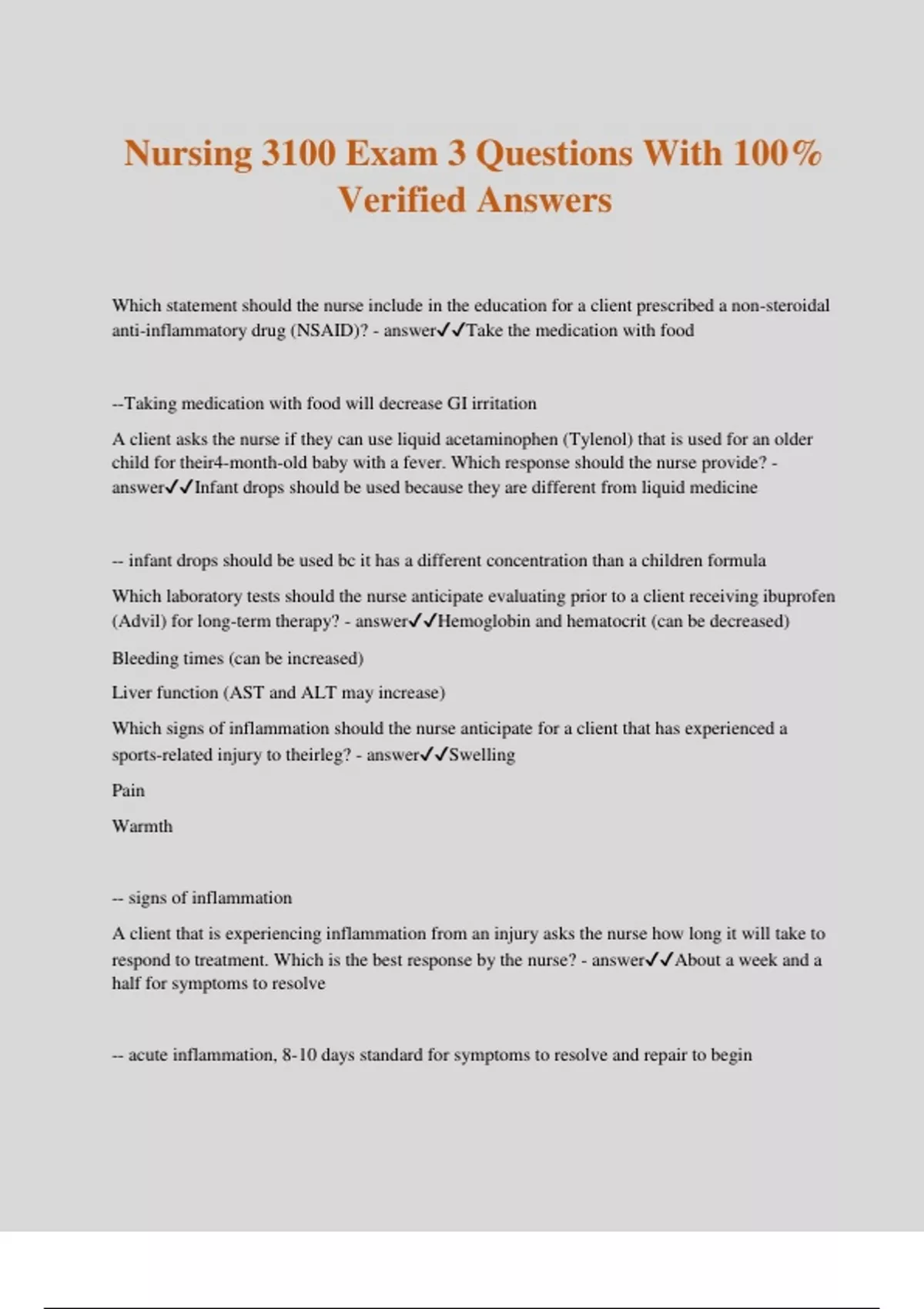 Nursing 3100 Exam 3 Questions With 100% Verified Answers Which statement should the nurse include in the education for a client prescribed a non-steroidal anti-inflammatory drug (NSAID)? - answerTake the medication with food --Taking medication with food will decrease GI irritation A client asks the nurse if they can use liquid acetaminophen (Tylenol) that is used for an older child for their4-month-old baby with a fever. Which response should the nurse provide? - answerInfant drops should be used because they are different from liquid medicine -- infant drops should be used bc it has a different concentration than a children formula Which laboratory tests should the nurse anticipate evaluating prior to a client receiving ibuprofen (Advil) for long-term therapy? - answerHemoglobin and hematocrit (can be decreased) Bleeding times (can be increased) Liver function (AST and ALT may increase) Which signs of inflammation should the nurse anticipate for a client that has experienced a sports-related injury to theirleg? - answerSwelling Pain Warmth -- signs of inflammation A client that is experiencing inflammation from an injury asks the nurse how long it will take to respond to treatment. Which is the best response by the nurse? - answerAbout a week and a half for symptoms to resolve -- acute inflammation, 8-10 days standard for symptoms to resolve and repair to begin The nurse has provided education about the action of histamines for a client. Which statement indicates an understanding of the information? - answerHistamine dilates blood vessels causing capillaries to become more permeable. Affected area may become congested with blood. A client tells the nurse they would prefer to indefinitely take prednisone to treat their inflammatory disease. Which is the best response by the nurse? - answerNot recommended due to the serious side effects -- systemic glucocorticoids are reserved for the short-term treatment of severe disease because of potentially serious AEs Which describes the direct action of acetaminophen (Tylenol) for fever reduction? - answerDilation of peripheral blood vessels Direct action at level of hypothalamus -- enables sweating and dissipation of heat Which statement made by a client indicates an understanding of the maximum daily amount of ibuprofen (Motrin)? - answerI cannot take over 3200 mg/day -- 24 hours (80 mg 4x) Which statement should the nurse include in the parental teaching for the administration of acetaminophen (Tylenol) to a child? - answerRead the labels of all OTC medications for amount of Tylenol -- to avoid overdoing child Which outcome should the nurse include in the plan of care for the older client receiving non- steroidal anti-inflammatory drug (NSAID) therapy? - answerReport any bleeding or bruising while taking NSAID -- older adults at risk for increased bleeding w NSAID therapy For which finding should the nurse notify the healthcare provider for a client prescribed prednisone? - answerUnexplained fever --not to be used on client with suspected systemic infection, notify healthcare provider immediately Which of the client's current prescriptions should the nurse consult the healthcare provider about who has prescribed acetaminophen (Tylenol) four times a day? - answerWarfarin (Coumadin) 2 mg orally every day -- Tylenol inhibits metabolism of warfarin, use of both could result in toxic accumulation of warfarin Which should the nurse monitor a client for that is receiving a salicylate? - answerOtotoxicity Nephrotoxicity -- monitored for tinnitus, difficulty hearing, light headedness, difficulty balancing Urine output and periodic kidney functions should be evaluated Which findings are symptoms of inflammation? - answerRedness - antigen reaction Warmth - vasodialtion Itching - histamine release Pain Which is an early laboratory marker of inflammation? - answerC-reactive protein -- protein found in plasma and early marker of inflammation Which finding is a common adverse effect of an anti-inflammatory prescription? - answerHeartburn and GI upset Which should a client be monitored for when prescribed a glucocorticoid? - answerBruising -- long-term glucocorticoid use can result in susceptibility to bruising Which describes the mechanism of action for Ibuprofen (Advil)? - answerInhibition of prostaglandin synthesis Which instructions should the nurse include in the teaching for a client prescribed aspirin (ASA)? - answerTake the aspirin with a glass of milk