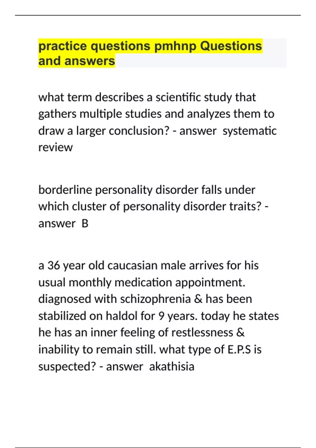 practice questions pmhnp Questions and answers