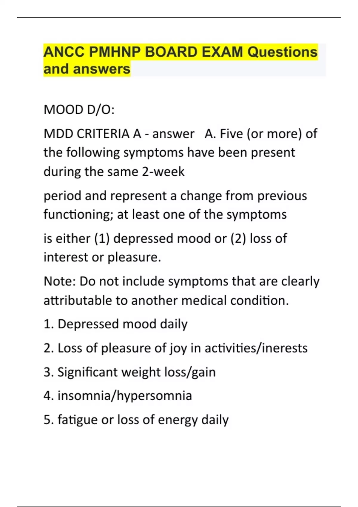 MOOD D/O: MDD CRITERIA A A. Five (or more) of the following symptoms have been present during the same 2-week period and represent a change from previous functioning; at least one of the symptoms is either (1) depressed mood or (2) loss of interest or pleasure. Note: Do not include symptoms that are clearly attributable to another medical condition. 1. Depressed mood daily 2. Loss of pleasure of joy in activities/inerests 3. Significant weight loss/gain 4. insomnia/hypersomnia 5. fatigue or loss of energy daily 6. psychomotor retardationagitation 7. feelings of worthlessness or guilt 8. diminished ability to think/concentrate, indecisiveness 9. recurrent thoughts of death, SI, or SI attempt MOOD D/O: MDD CRITERIA B-E B. The symptoms cause clinically significant distress or impairment in social, occupational, or other important areas of functioning. C. The episode is not attributable to the physiological effects of a substance or to another medical condition. D. The occurrence of the major depressive episode is not better explained by schizoaffective disorder, schizophrenia, schizophreniform disorder, delusional disorder, or other specified and unspecified schizophrenia spectrum and other psychotic disorders. E. There has never been a manic episode or a hypomanic episode. Note: This exclusion does not apply if all of the manic-like or hypomanic-like episodes are substance-induced or are attributable to the physiological effects of another medical condition. MOOD D/O: MDD PREVALENCE Twelve-month prevalence of major depressive disorder in the United States is approximately 7%, with marked differences by age group such that the prevalence in 18- to 29-year-old individuals is threefold higher than the prevalence in individuals age 60 years or older. Females experience 1.5- to 3-fold higher rates than males beginning in early adolescence. MOOD D/O: MDD DEVELOPMENT AND COURSE -Recovery typically begins within 3 months of onset for two in five individuals with major depression and within 1 year for four in five individuals. -The risk is higher in individuals whose preceding episode was severe, in younger individuals, and in individuals who have already experienced multiple episodes. -The persistence of even mild depressive symptoms during remission is a powerful predictor of recurrence. MOOD D/O: MDD RISK FACTORS -Neuroticism (negative affectivity) is a well-established risk factor for the onset of major depressive disorder -Adverse childhood experiences, particularly when there are multiple experiences of diverse types, constitute a set of potent risk factors for major depressive disorder. -Stressful life events are well recognized as precipitants of major depressive episodes,but the presence or absence of adverse life events near the onset of episodes does not appear to provide a useful guide to prognosis or treatment selection. -First-degree family members of individuals with major depressive disorder have a risk for major depressive disorder two- to fourfold higher than that of the general population. -Relative risks appear to be higher for early-onset and recurrent forms. Heritability is approximately 40%, and the personality trait neuroticism accounts for a substantial portion of this genetic liability. MOOD D/O: PDD (DYSTHYMIA) DSM5 CRITERIA Depressed mood for most of the day, for more days than not, as indicated by either subjective account or observation by others, for at least 2 years. Note: In children and adolescents, mood can be irritable and duration must be at least 1 year. B. Presence, while depressed, of two (or more) of the following: 1. Poor appetite or overeating. 2. Insomnia or hypersomnia. 3. Low energy or fatigue. 4. Low self-esteem. 5. Poor concentration or difficulty making decisions. 6. Feelings of hopelessness. C. During the 2-year period (1 year for children or adolescents) of the disturbance, the individual has never been without the symptoms in Criteria A and B for more than 2 months at a time. D. Criteria for a major depressive disorder may be continuously present for 2 years. E. There has never been a manic episode or a hypomanic episode, and criteria have never been met for cyclothymic disorder. F. The disturbance is not better explained by a persistent schizoaffective disorder, schizophrenia, delusional disorder, or other specified or unspecified schizophrenia spectrum and other psychotic disorder. G. The symptoms are not attributable to the physiological effects of a substance (e.g., a drug of abuse, a medication) or another medical condition (e.g. hypothyroidism). H. The symptoms cause clinically significant distress or impairment in social, occupational, or other important areas of functioning. Note: Because the criteria for a major depressive episode include four symptoms that are absent from the symptom list for persistent depressive disorder (dysthymia), a very limited number of individuals will have depressive symptoms that have persisted longer than 2 years but will not meet criteria for persistent depressive disorder. If full criteria for a major depressive episode have been met at some point during the current episode o MOOD D/O: DYSTHYMIA PREVALENCE The 12-month prevalence in the United States is approximately 0.5% for persistent depressive disorder and 1.5% for chronic major depressive disorder. MOOD D/O: DYSTHYMIA DEVELOPMENT COURSE Persistent depressive disorder often has an early and insidious onset (i.e., in childhood, adolescence, or early adult life) and, by definition, a chronic course. Among individuals with both persistent depressive disorder and borderline personality disorder, the covariance of the corresponding features over time suggests the operation of a common mechanism. Early onset (i.e., before age 21 years) is associated with a higher likelihood of comorbid personality disorders and substance use disorders. MOOD D/O: DYSTHYMIA RISK FACTORS -Factors predictive of poorer long-term outcome include higher levels of neuroticism (negativ