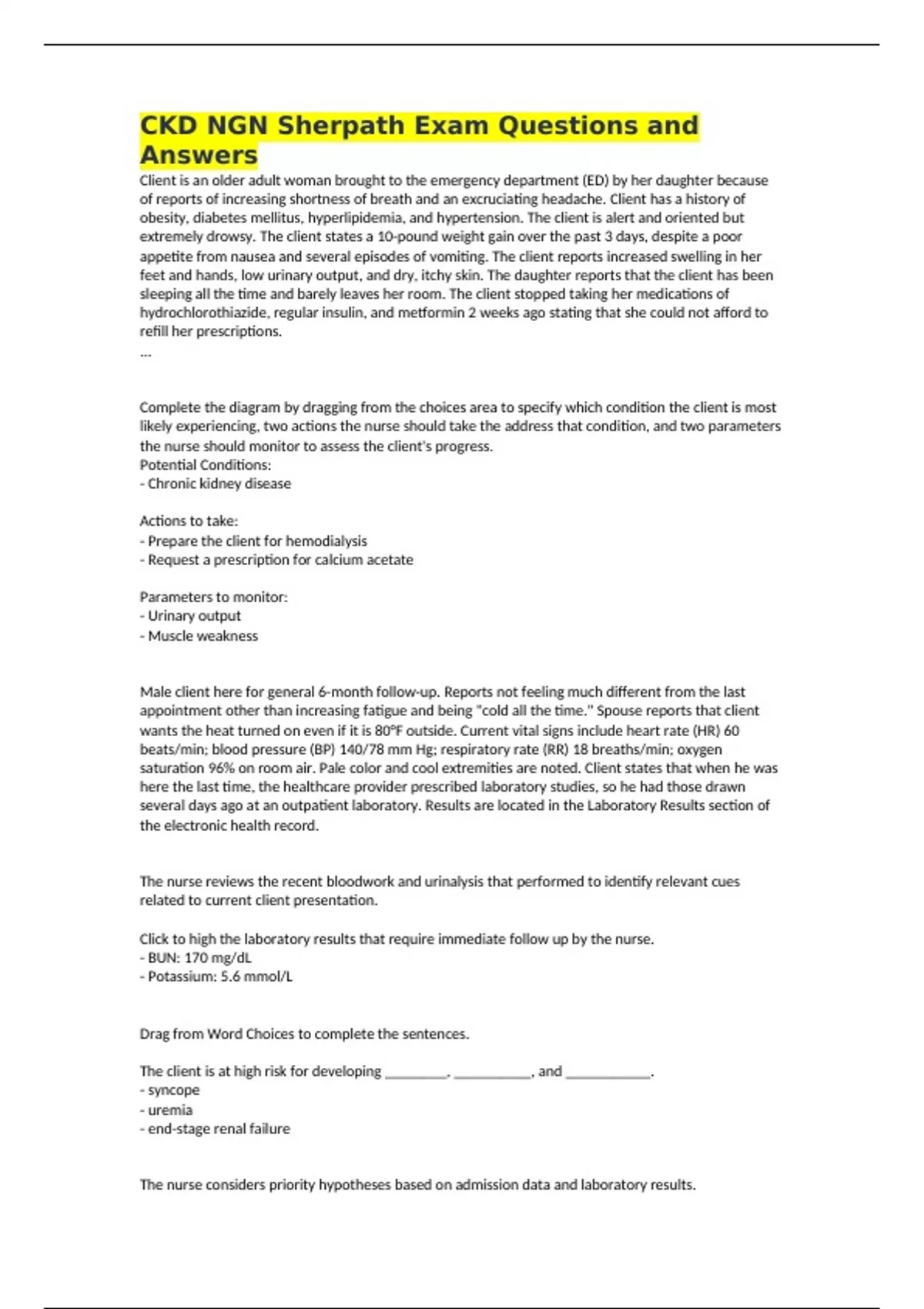 CKD NGN Sherpath Exam Questions and Answers Client is an older adult woman brought to the emergency department (ED) by her daughter because of reports of increasing shortness of breath and an excruciating headache. Client has a history of obesity, diabetes mellitus, hyperlipidemia, and hypertension. The client is alert and oriented but extremely drowsy. The client states a 10-pound weight gain over the past 3 days, despite a poor appetite from nausea and several episodes of vomiting. The client reports increased swelling in her feet and hands, low urinary output, and dry, itchy skin. The daughter reports that the client has been sleeping all the time and barely leaves her room. The client stopped taking her medications of hydrochlorothiazide, regular insulin, and metformin 2 weeks ago stating that she could not afford to refill her prescriptions. ... Complete the diagram by dragging from the choices area to specify which condition the client is most likely experiencing, two actions the nurse should take the address that condition, and two parameters the nurse should monitor to assess the client's progress. Potential Conditions: - Chronic kidney disease Actions to take: - Prepare the client for hemodialysis - Request a prescription for calcium acetate Parameters to monitor: - Urinary output - Muscle weakness Male client here for general 6-month follow-up. Reports not feeling much different from the last appointment other than increasing fatigue and being "cold all the time." Spouse reports that client wants the heat turned on even if it is 80°F outside. Current vital signs include heart rate (HR) 60 beats/min; blood pressure (BP) 140/78 mm Hg; respiratory rate (RR) 18 breaths/min; oxygen saturation 96% on room air. Pale color and cool extremities are noted. Client states that when he was here the last time, the healthcare provider prescribed laboratory studies, so he had those drawn several days ago at an outpatient laboratory. Results are located in the Laboratory Results section of the electronic health record. The nurse reviews the recent bloodwork and urinalysis that performed to identify relevant cues related to current client presentation. Click to high the laboratory results that require immediate follow up by the nurse. - BUN: 170 mg/dL - Potassium: 5.6 mmol/L Drag from Word Choices to complete the sentences. The client is at high risk for developing ________, __________, and ___________. - syncope - uremia - end-stage renal failure The nurse considers priority hypotheses based on admission data and laboratory results.