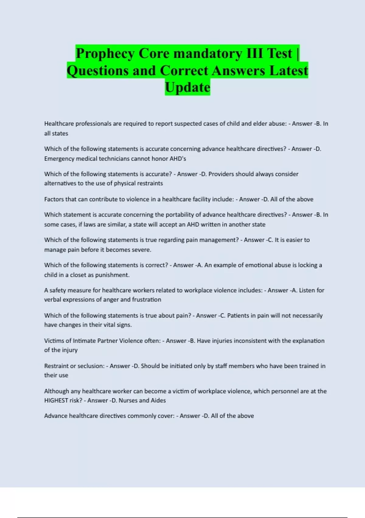 Prophecy Core mandatory III Test | Questions and Correct Answers Latest Update Healthcare professionals are required to report suspected cases of child and elder abuse: - Answer -B. In all states Which of the following statements is accurate concerning advance healthcare directives? - Answer -D. Emergency medical technicians cannot honor AHD's Which of the following statements is accurate? - Answer -D. Providers should always consider alternatives to the use of physical restraints Factors that can contribute to violence in a healthcare facility include: - Answer -D. All of the above Which statement is accurate concerning the portability of advance healthcare directives? - Answer -B. In some cases, if laws are similar, a state will accept an AHD written in another state Which of the following statements is true regarding pain management? - Answer -C. It is easier to manage pain before it becomes severe. Which of the following statements is correct? - Answer -A. An example of emotional abuse is locking a child in a closet as p