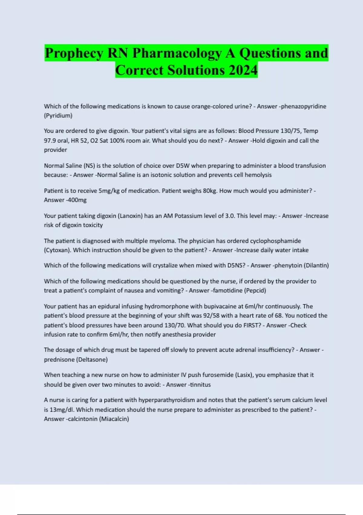 Prophecy RN Pharmacology A Questions and Correct Solutions 2024 Which of the following medications is known to cause orange-colored urine? - Answer -phenazopyridine (Pyridium) You are ordered to give digoxin. Your patient's vital signs are as follows: Blood Pressure 130/75, Temp 97.9 oral, HR 52, O2 Sat 100% room air. What should you do next? - Answer -Hold digoxin and call the provider Normal Saline (NS) is the solution of choice over D5W when preparing to administer a blood transfusion because: - Answer -Normal Saline is an isotonic solution and prevents cell hemolysis Patient is to receive 5mg/kg of medication. Patient weighs 80kg. How much would you administer? - Answer -400mg Your patient taking digoxin (Lanoxin) has an AM Potassium level of 3.0. This level may: - Answer -Increase risk of digoxin toxicity The patient is diagnosed with multiple myeloma. The physician has ordered cyclophosphamide (Cytoxan). Which instruction should be given to the patient? - Answer