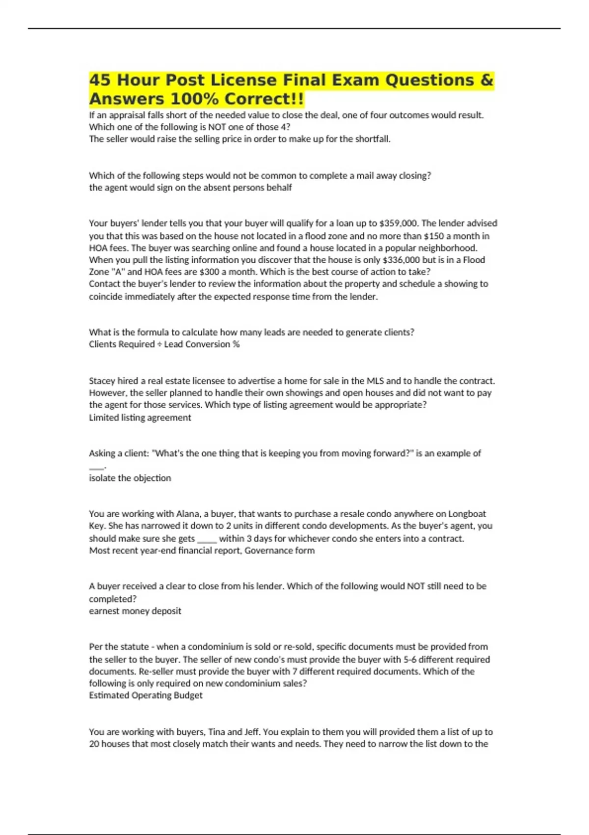 45 Hour Post License Final Exam Questions & Answers 100% Correct!! If an appraisal falls short of the needed value to close the deal, one of four outcomes would result. Which one of the following is NOT one of those 4? The seller would raise the selling price in order to make up for the shortfall. Which of the following steps would not be common to complete a mail away closing? the agent would sign on the absent persons behalf Your buyers' lender tells you that your buyer will qualify for a loan up to $359,000. The lender advised you that this was based on the house not located in a flood zone and no more than $150 a month in HOA fees. The buyer was searching online and found a house located in a popular neighborhood. When you pull the listing information you discover that the house is only $336,000 but is in a Flood Zone "A" and HOA fees are $300 a month. Which is the best course of action to take? Contact the buyer's lender to review the information about the property and schedule a showing to coincide immediately after the expected response time from the lender. What is the formula to calculate how many leads are needed to generate clients? Clients Required ÷ Lead Conversion % Stacey hired a real estate licensee to advertise a home for sale in the MLS and to handle the contract. However, the seller planned to handle their own showings and open houses and did not want to pay the agent for those services. Which type of listing agreement would be appropriate? Limited listing agreement Asking a client: "What's the one thing that is keeping you from moving forward?" is an example of ___. isolate the objection You are working with Alana, a buyer, that wants to purchase a resale condo anywhere on Longboat Key. She has narrowed it down to 2 units in different condo developments. As the buyer's agent, you should make sure she gets ____ within 3 days for whichever condo she enters into a contract. Most recent year-end financial report, Governance form A buyer received a clear to close from his lender. Which of the following would NOT still need to be completed? earnest money deposit Per the statute - when a condominium is sold or re-sold, specific documents must be provided from the seller to the buyer. The seller of new condo's must provide the buyer with 5-6 different required documents. Re-seller must provide the buyer with 7 different required documents. Which of the following is only required on new condominium sales? Estimated Operating Budget You are working with buyers, Tina and Jeff. You explain to them you will provided them a list of up to 20 houses that most closely match their wants and needs. They need to narrow the list down to the