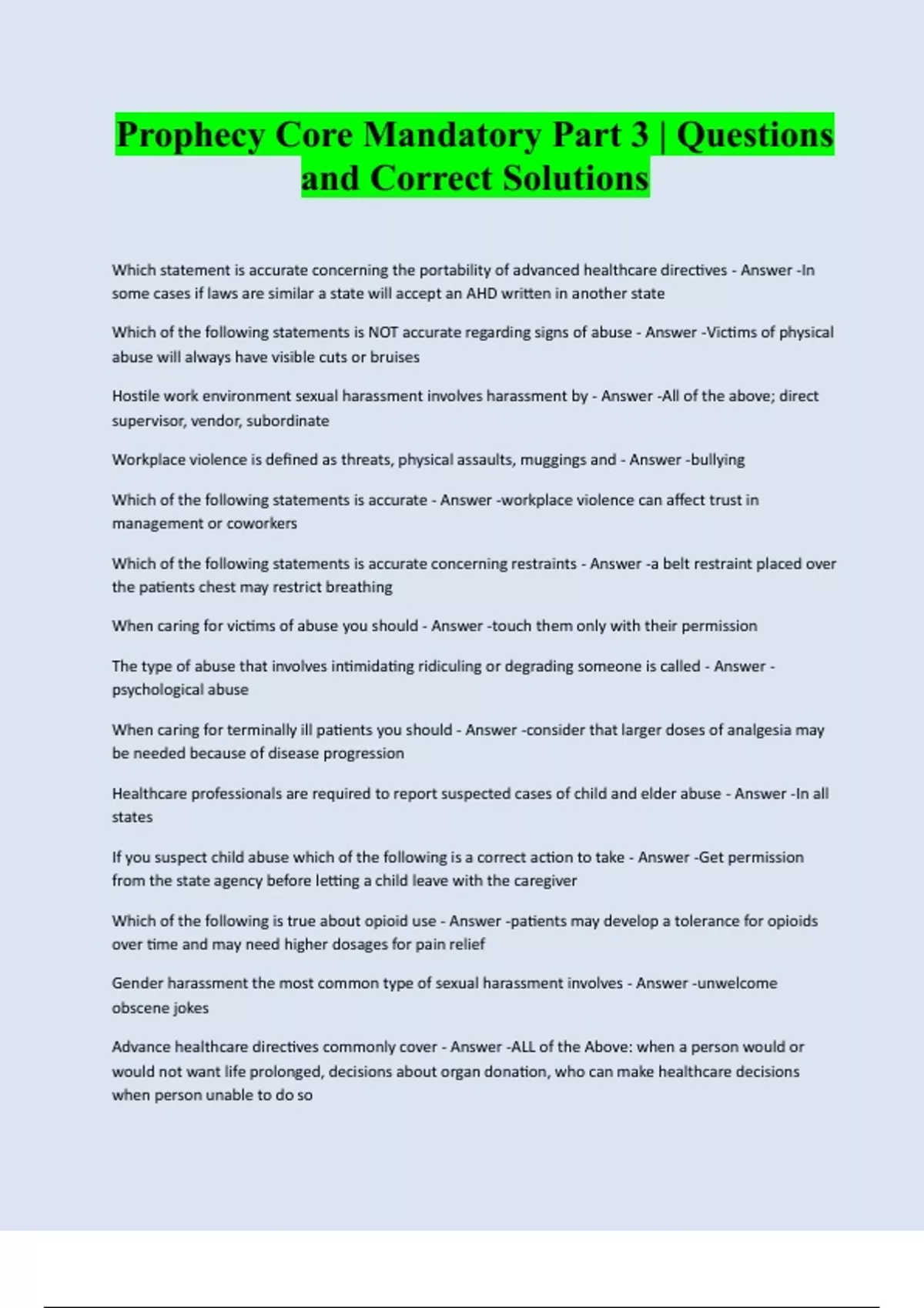 Prophecy Core Mandatory Part 3 | Questions and Correct Solutions Which statement is accurate concerning the portability of advanced healthcare directives - Answer -In some cases if laws are similar a state will accept an AHD written in another state Which of the following statements is NOT accurate regarding signs of abuse - Answer -Victims of physical abuse will always have visible cuts or bruises Hostile work environment sexual harassment involves harassment by - Answer -All of the above; direct supervisor, vendor, subordinate Workplace violence is defined as threats, physical assaults, muggings and - Answer -bullying Which of the following statements is accurate - Answer -workplace violence can affect trust in management or coworkers Which of the following statements is accurate concerning restraints - Answer -a belt restraint placed over the patients chest may restrict breathing When caring for victims of abuse you should - Answer -touch them only with their permiss