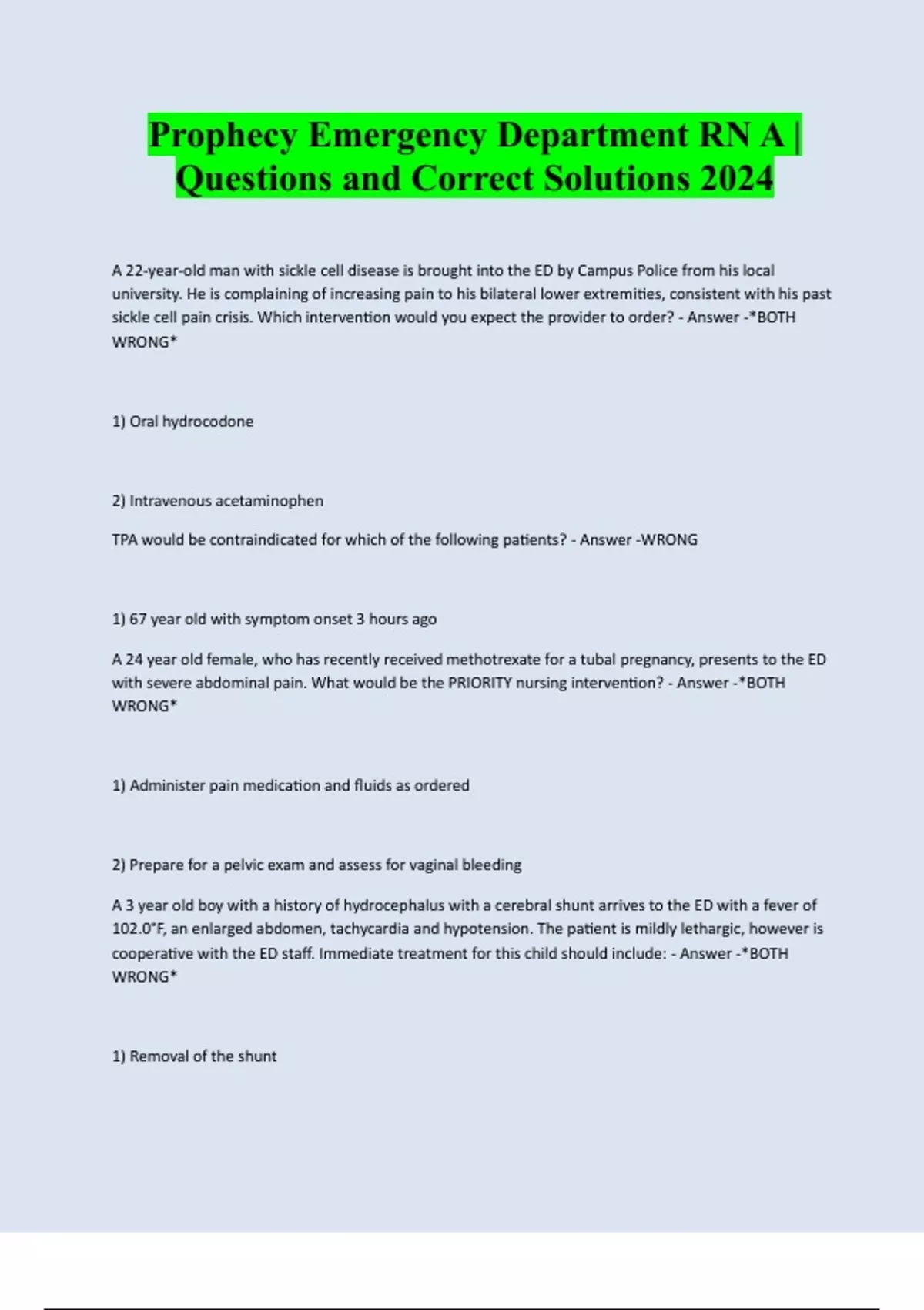 Prophecy Emergency Department RN A | Questions and Correct Solutions 2024 A 22-year-old man with sickle cell disease is brought into the ED by Campus Police from his local university. He is complaining of increasing pain to his bilateral lower extremities, consistent with his past sickle cell pain crisis. Which intervention would you expect the provider to order? - Answer -*BOTH WRONG* 1) Oral hydrocodone 2) Intravenous acetaminophen TPA would be contraindicated for which of the following patients? - Answer -WRONG 1) 67 year old with symptom onset 3 hours ago A 24 year old female, who has recently received methotrexate for a tubal pregnancy, presents to the ED with severe abdominal pain. What would be the PRIORITY nursing intervention? - Answer -*BOTH WRONG* 1) Administer pain medication and fluids as ordered 2) Prepare for a pelvic exam and assess for vaginal bleeding A 3 year old boy with a history of hydrocephalus with a cerebral shunt arrives to the ED with a fever of 102.0°F, an enlarged abdomen, tachycardia and hypotension. The patient is mildly lethargic, however is cooperative with the ED staff. Immediate treatment for this child should include: - Answer -*BOTH WRONG* 1)