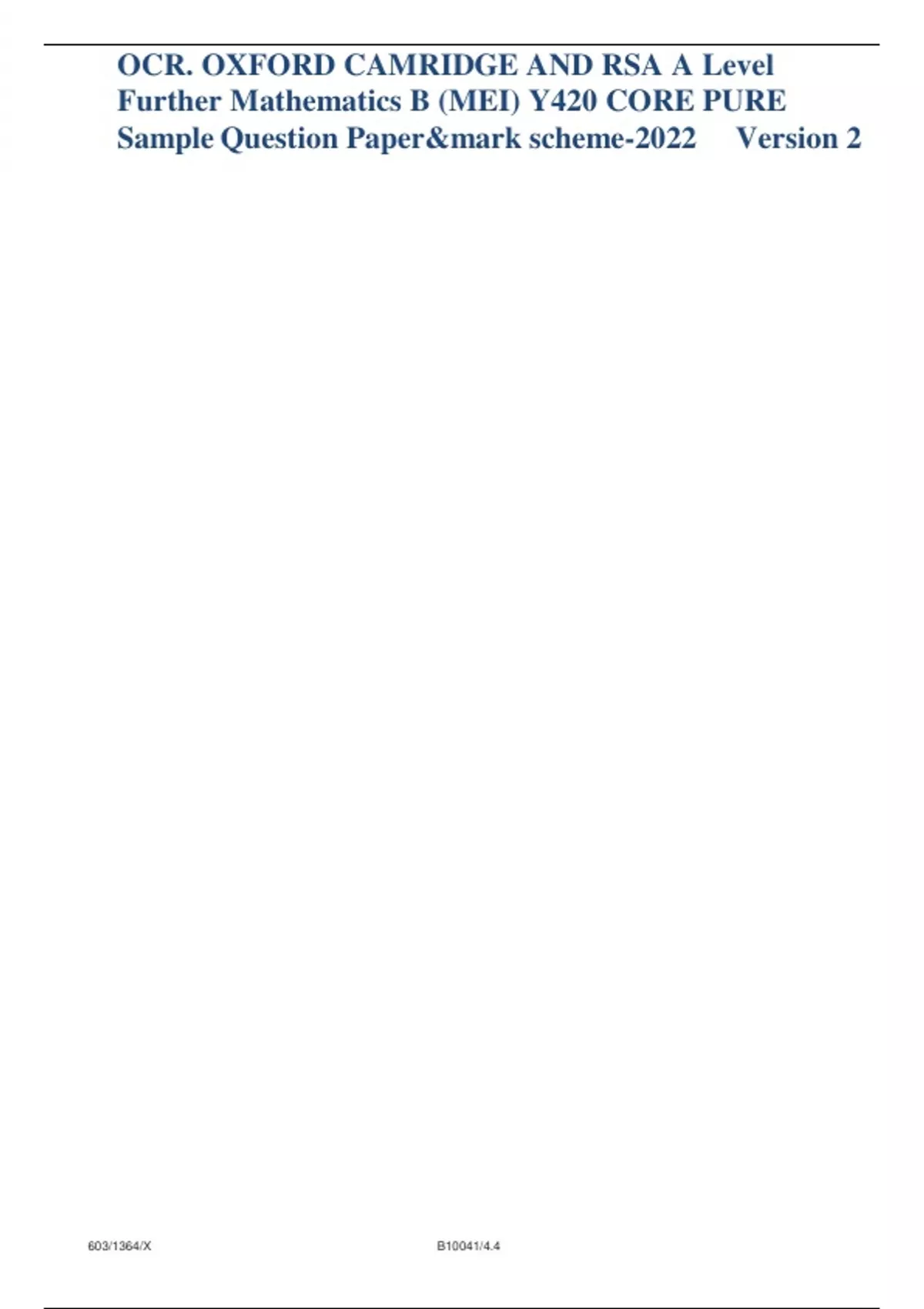 OCR. OXFORD CAMRIDGE AND RSA A Level Further Mathematics B (MEI) Y420 CORE PURE Sample Question Paper&mark scheme-2022 Version 2